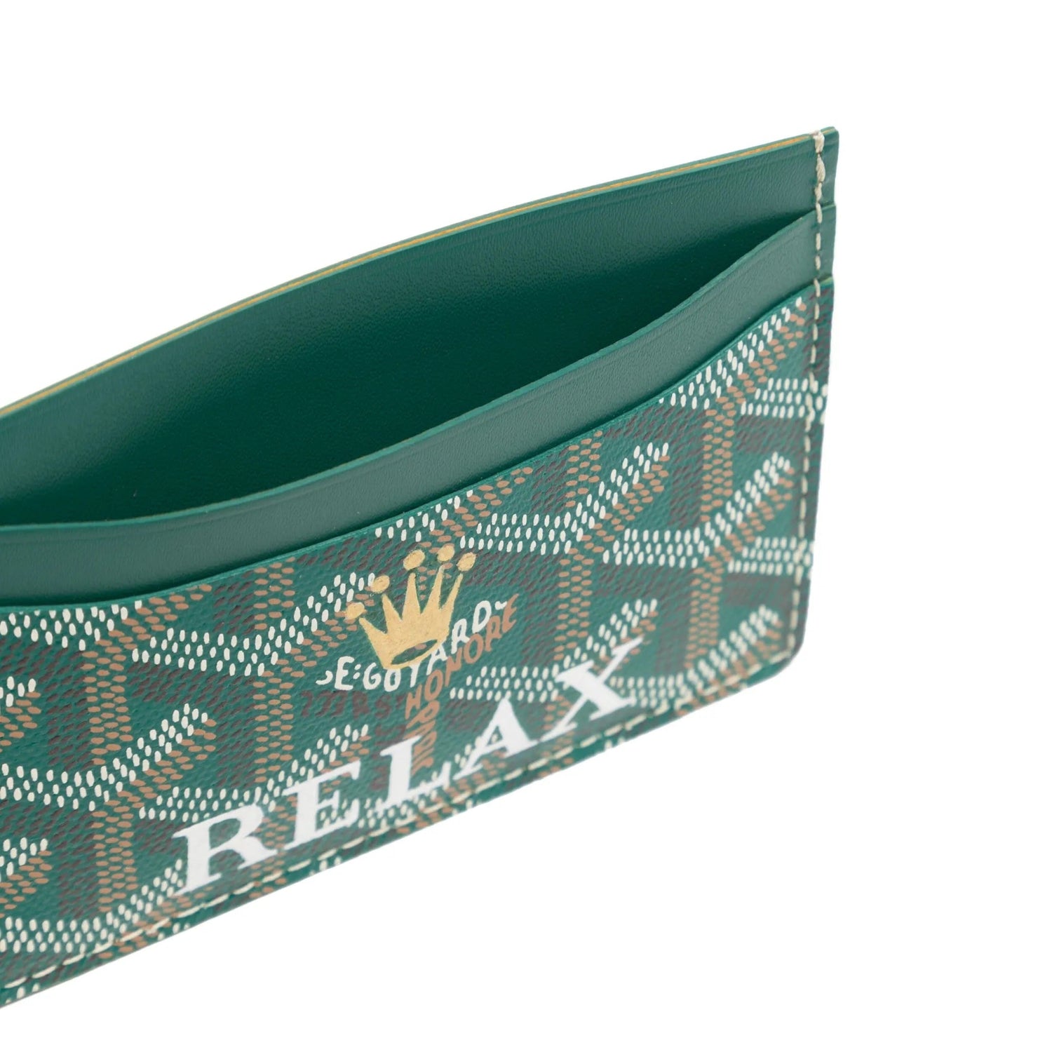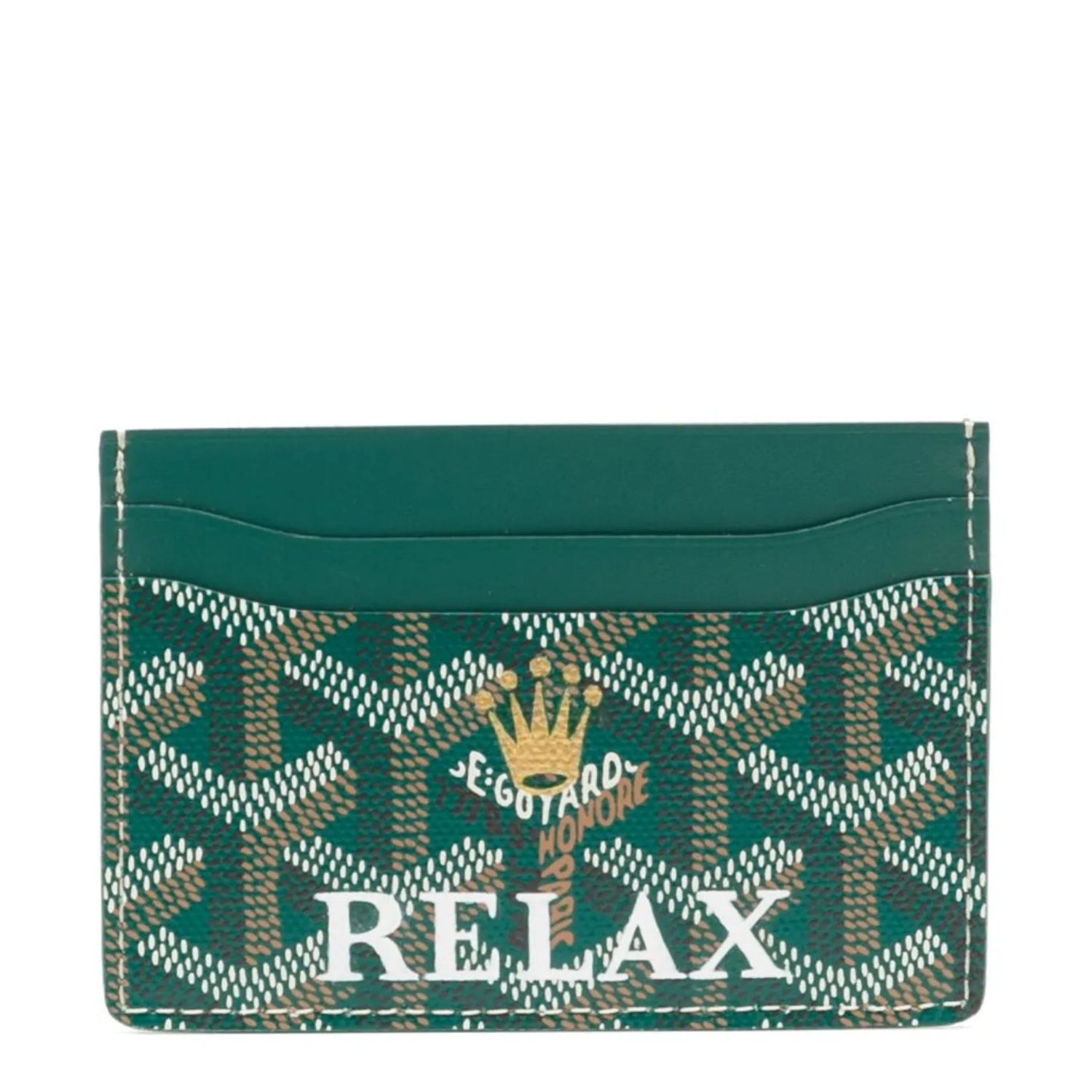 Crafted from canvas and leather, this customised Rolex Relax Saint-Sulpice wallet features Goyard's signature monogram print. Perfect for organising cards, it has 4 card pockets and a central pocket with a yellow interior. and hand-painted print design on the front. Both fun and functional, it features a hand-painted print design on the front as well as a debossed logo stamp.