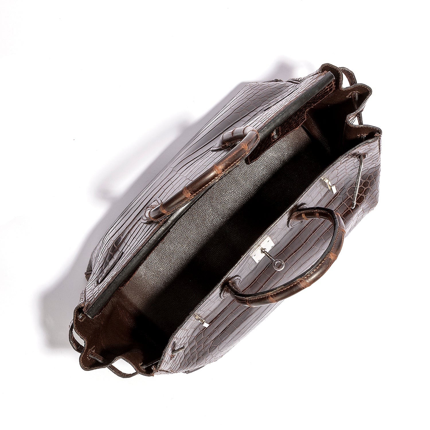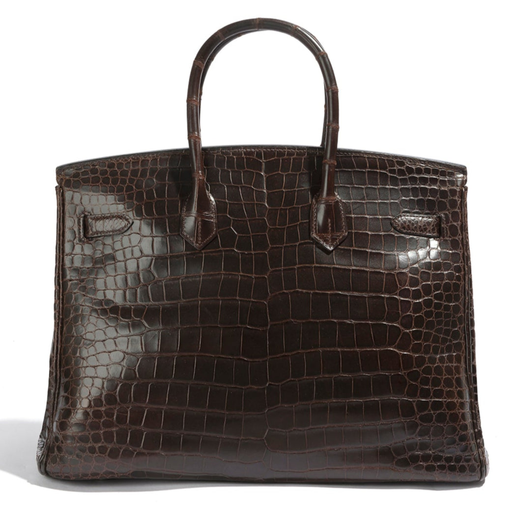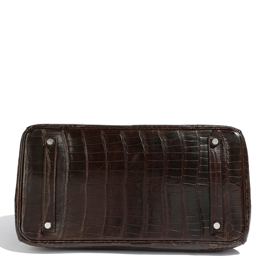 Elevate your style with the timeless elegance of the Hermès Birkin 35 in Marron crocodile leather. This exquisite piece, handcrafted in 2008, features palladium hardware and shows only subtle signs of wear. A luxurious and versatile addition to any outfit.