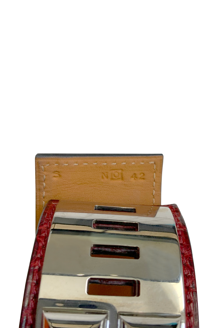 - Burgundy exotic leather with a tan calfskin lining
