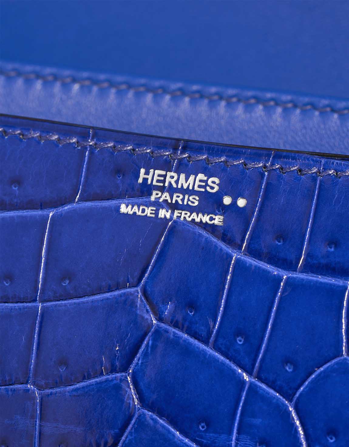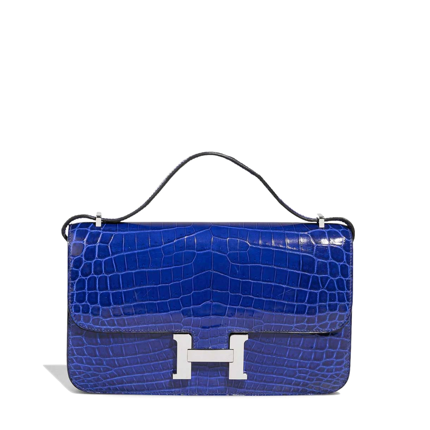 This 25cm Constance Elan shoulder bag from Hermès was meticulously crafted in France from a highly precious exotic in an electric shade of blue. Offset with silver-tone palladium-plated hardware, its slender body is adorned with the brand's signature "H" snap-lock fastening, a rear pocket and an adjustable crossbody shoulder strap. The blue leather-lined interior is split into two compartments and opens to reveal an open slip pocket and concealed front centre logo stamp.