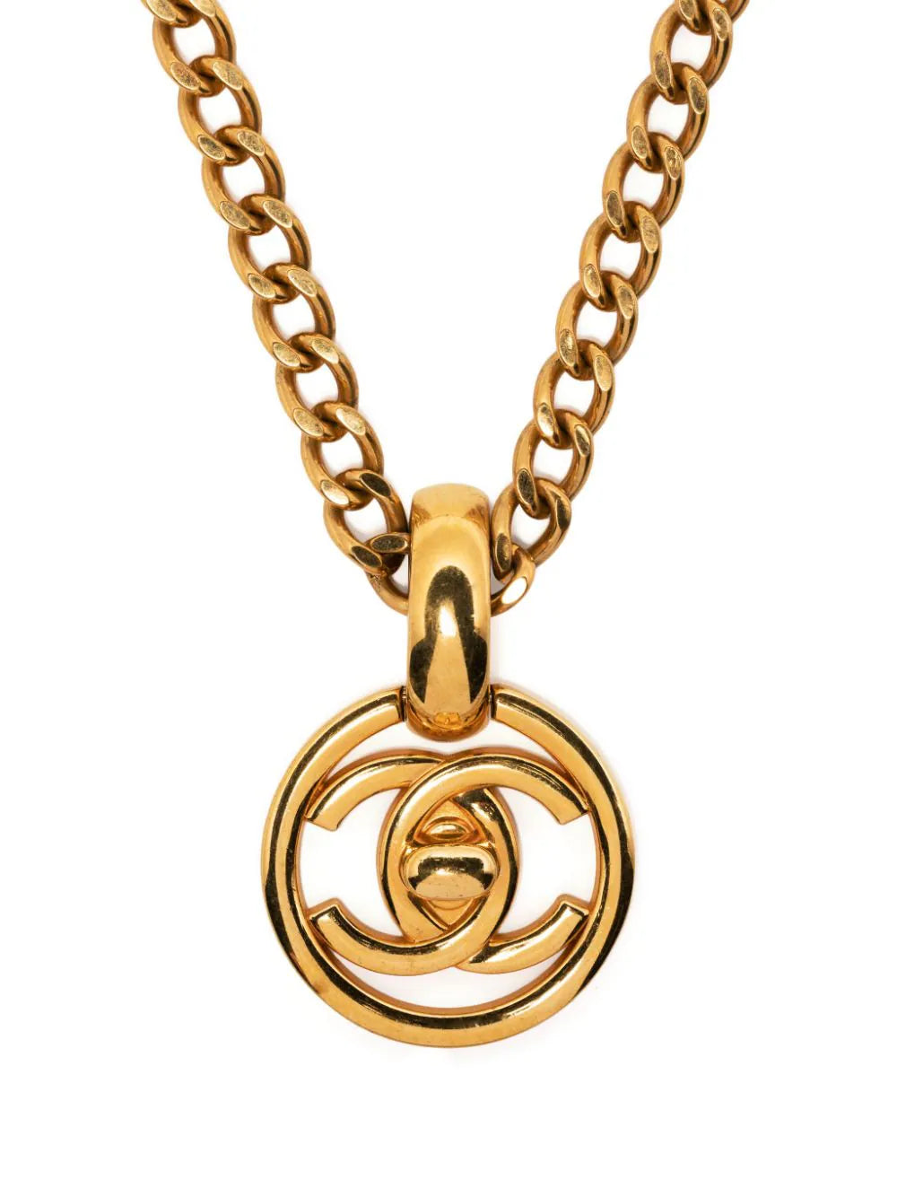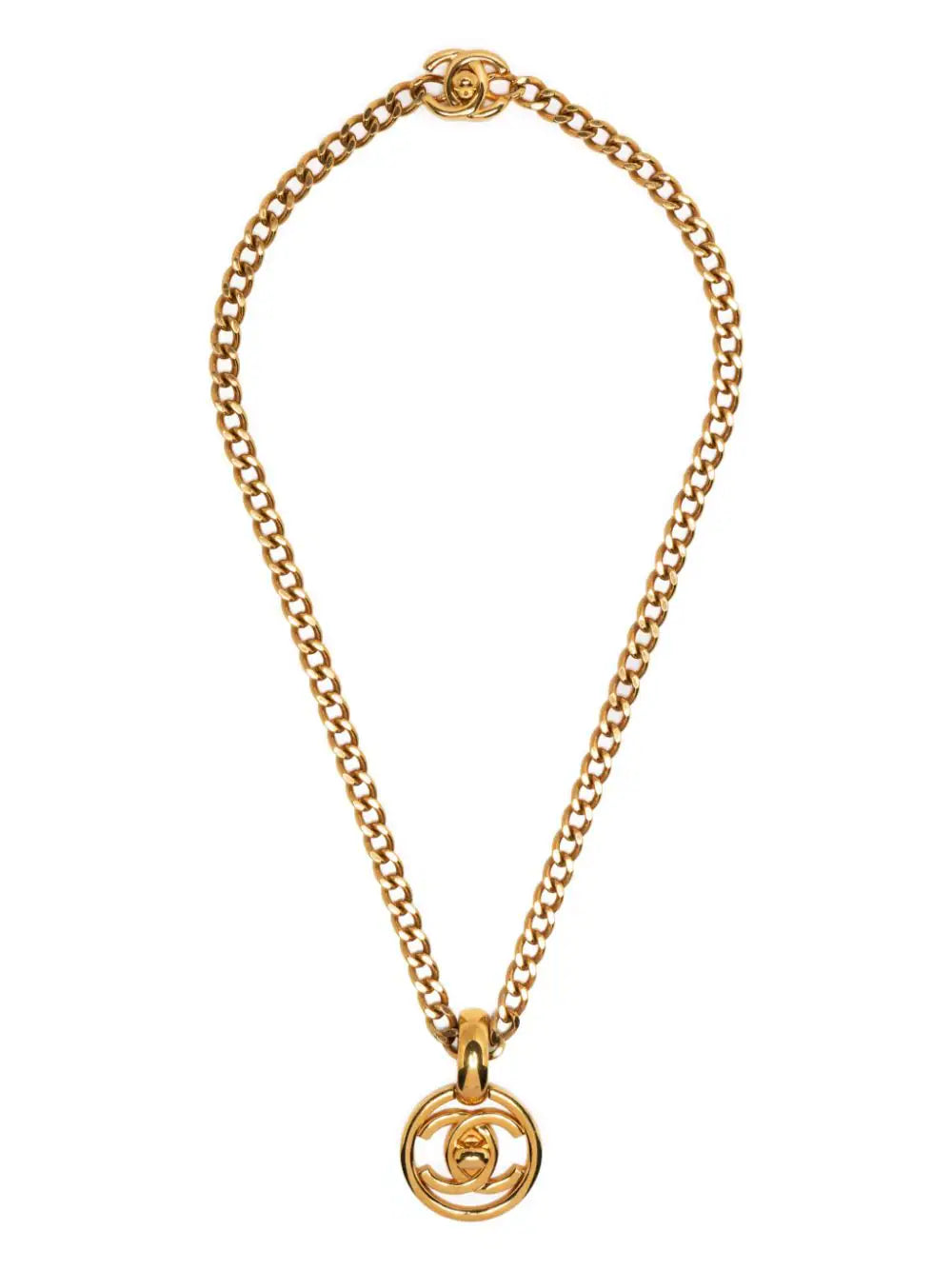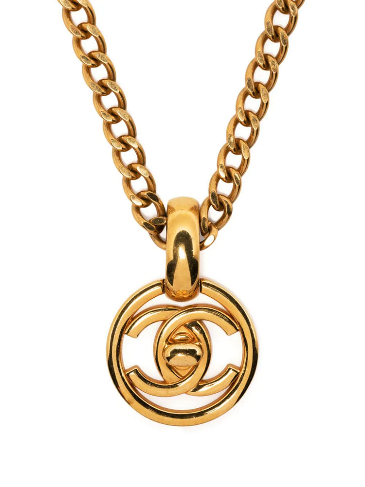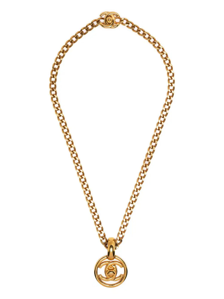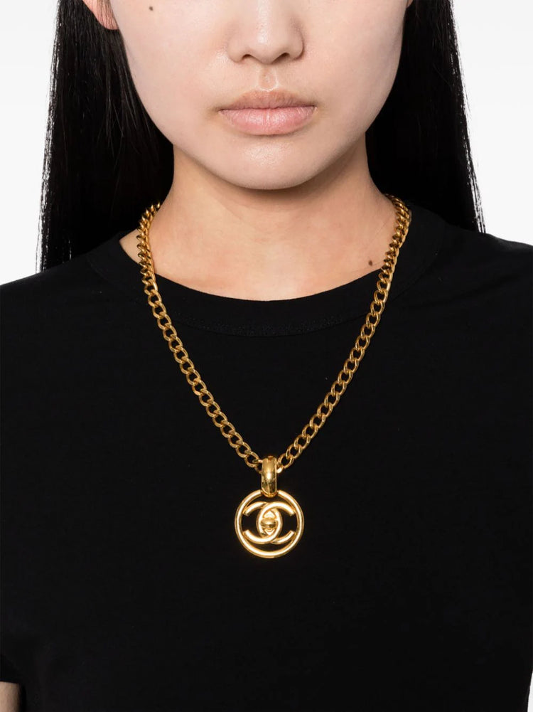 Chanel's iconic interlocking CC turn-lock was introduced in the 1980s by Karl Lagerfeld. This curb chain necklace displays the timeless motif in gold plating.