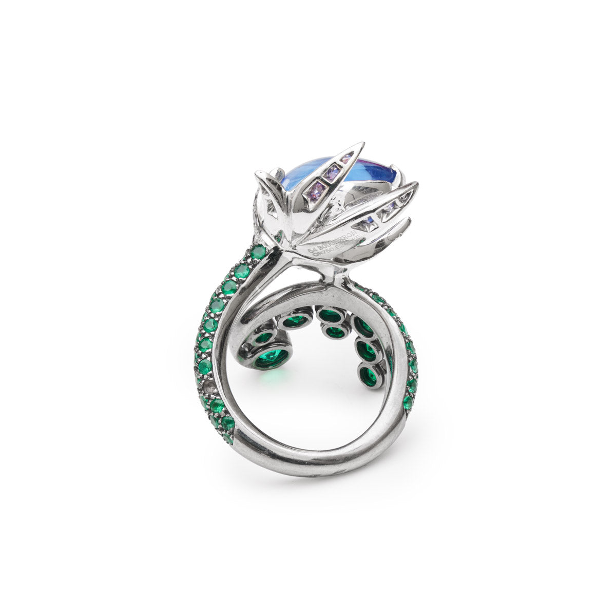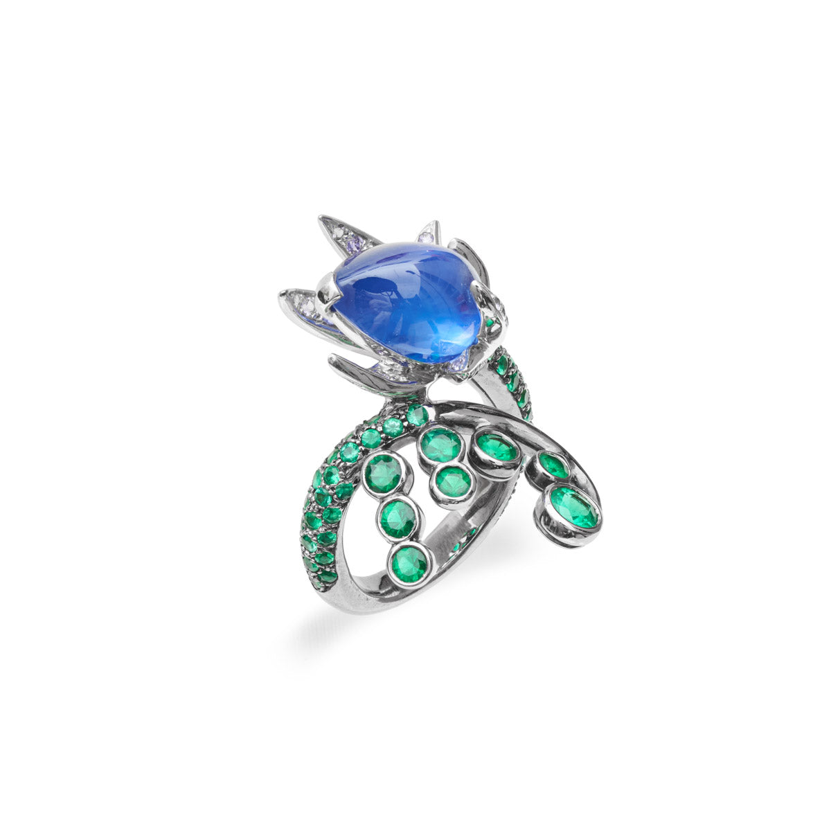 This exquisite Boucheron ring showcases a harmonious blend of deep blue sapphires and vibrant emeralds, set in elegant and durable white gold. This ring combines classic design with contemporary sophistication, creating a refined and timeless statement piece.