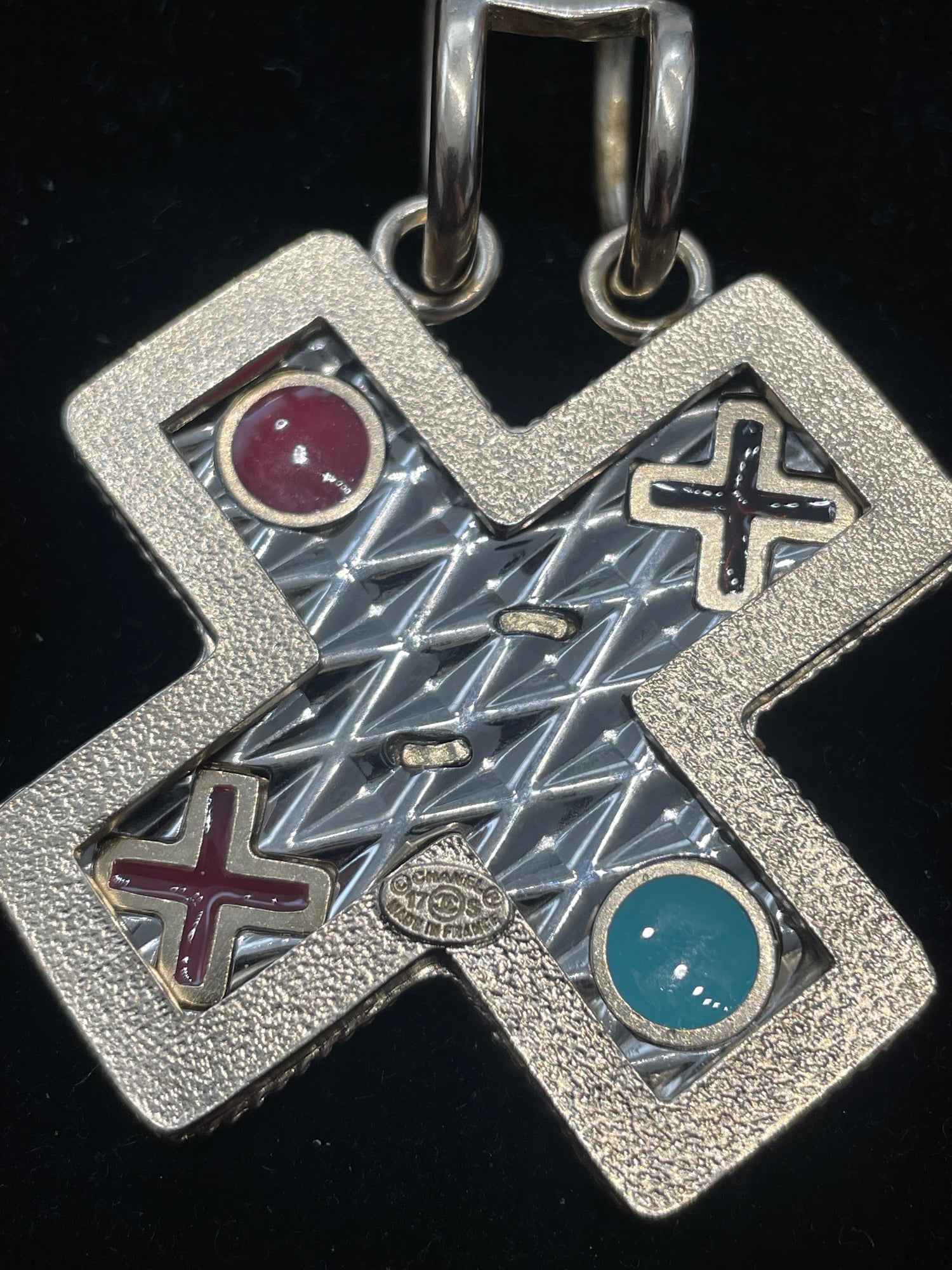 Add a special piece to your jewellery repertoire! Displaying a large cross motif, an iconic symbol of Chanel, this pre-owned earring was part of Maison's Fall 2017 runway collection. Crafted from silver and champagne metal, and finished with two small red enamel crosses and two enamel circles with a cross that hangs from a mono clip that secures your lobe with a clip-on fastening. Style with neutral tones to make these the focus of your outfit.