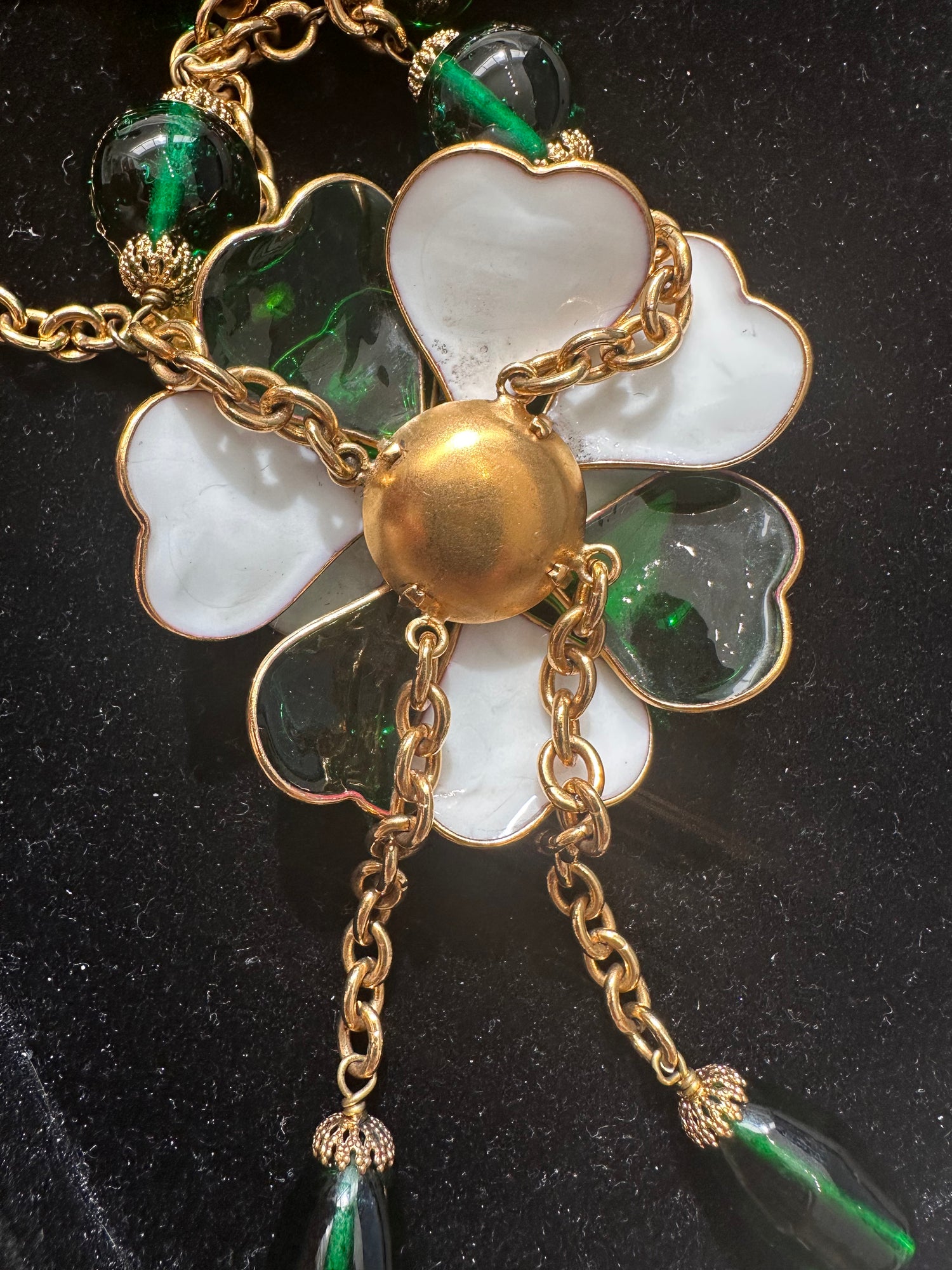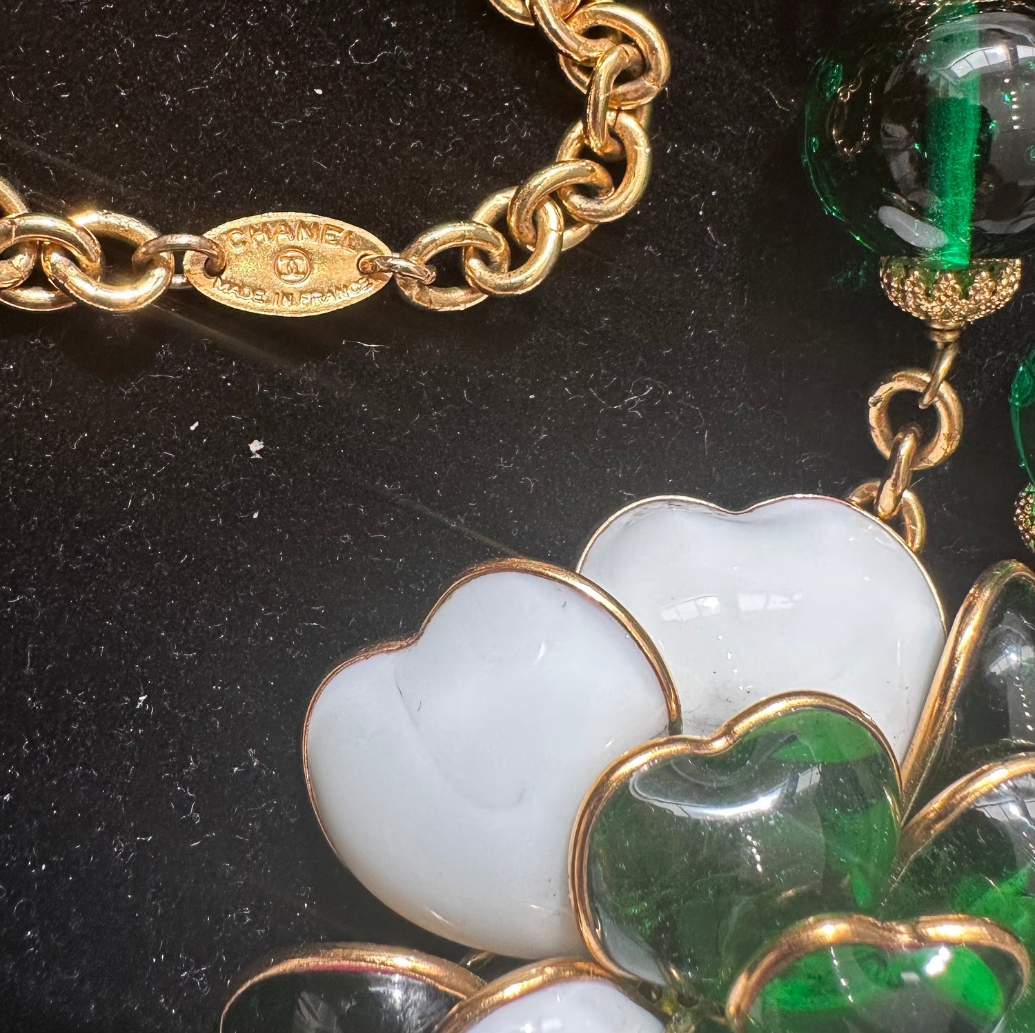 Designed with baroque detailing, this vintage pre-owned Chanel by Gripoix necklace from the 1980's displays large green beads against a chunky gold-tone chain. The focus of the necklace is a large green and white camellia flower, a symbol used throughout many of Chanel's collections as it was Coco Chanel's favourite flower. Secured using a spring-ring clasp, this unique piece will complement everything from cocktail dresses to silky tops and leather pants.