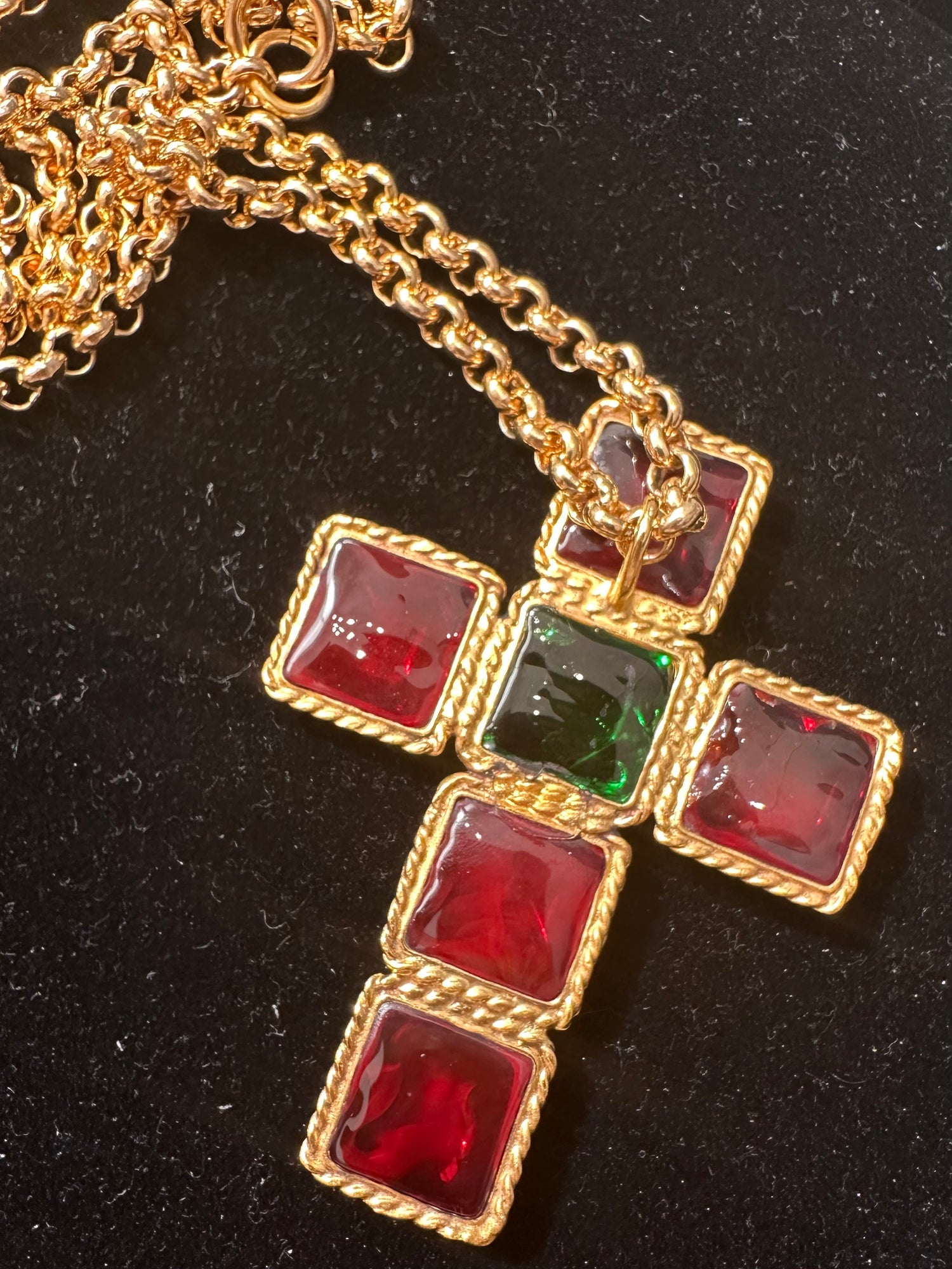 Designed by Gripoix in the style of Chanel, this bold necklace displays a large gold-toned cross motif decorated with red and green cabochons hanging from a chunky gold chain. Secure using a spring ring fastening, this statement piece will uplift any outfit. Layer this 'X' style with something dainty or gold.