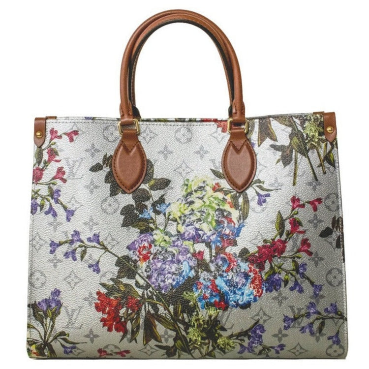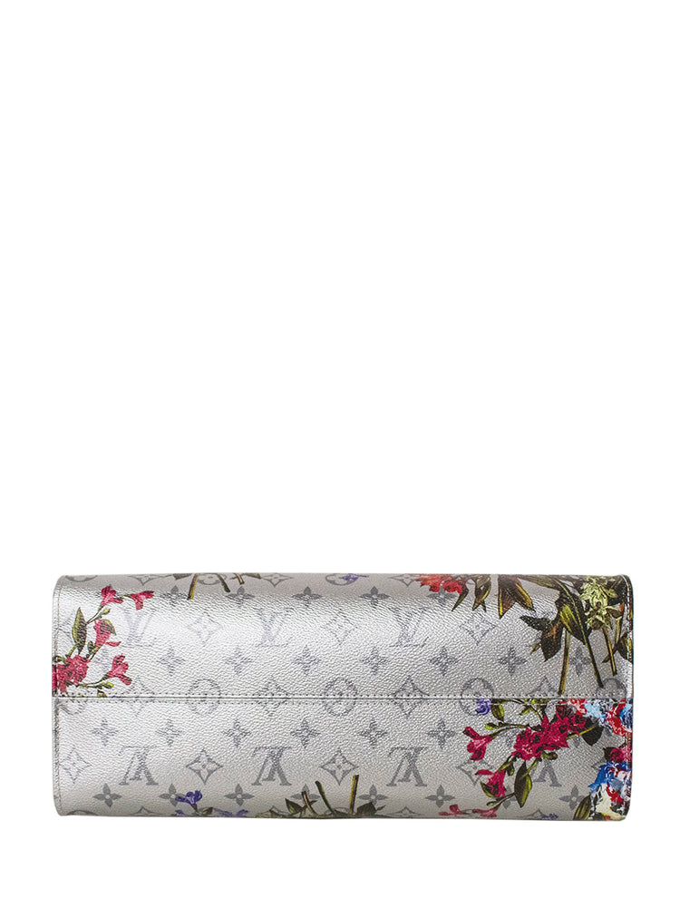 Featuring a feminine floral design and metallic-silver coated canvas, the OnTheGo MM tote by Nicolas Ghesquière adds a touch of elegance to any outfit. The bold pattern is complemented by a subtle Monogram motif in the background, and the microfiber lining adds a luxurious touch. This versatile carryall includes top handles and long leather shoulder straps for convenient carrying.