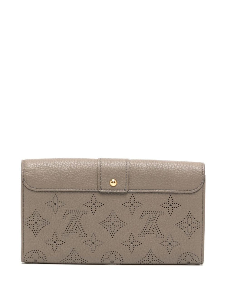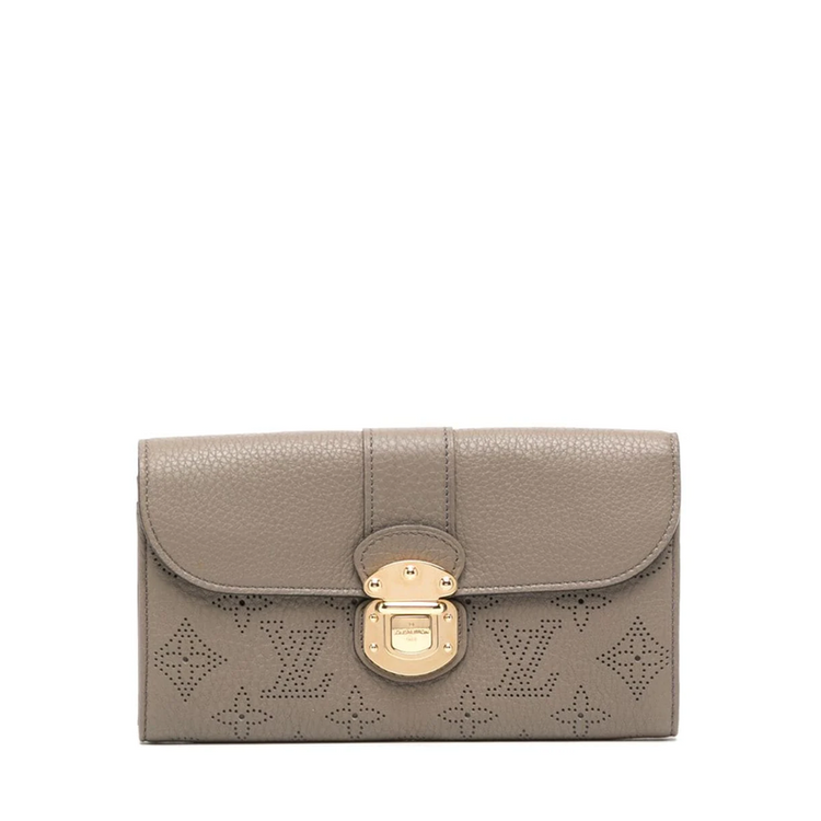 This luxurious Taupe Mahina Amelia Wallet is crafted from premium leather, featuring a signature perforated Monogram, foldover top, and push-lock fastening. Internally, it is partitioned with internal card slots, a zip-fastening pocket, and a debossed internal logo. The wallet is completed with a leather lining and gold-tone hardware for an elegant look.