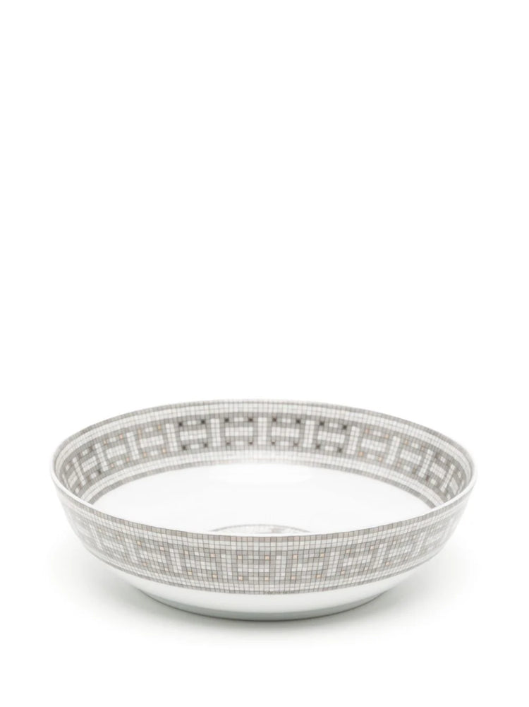 - Bowl and spoon set from Hermès with a tonal grey mosaic adorning the rim.
