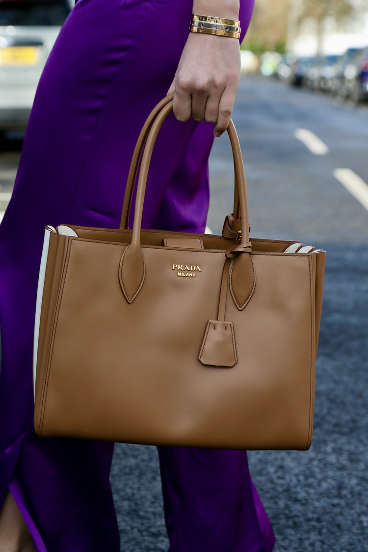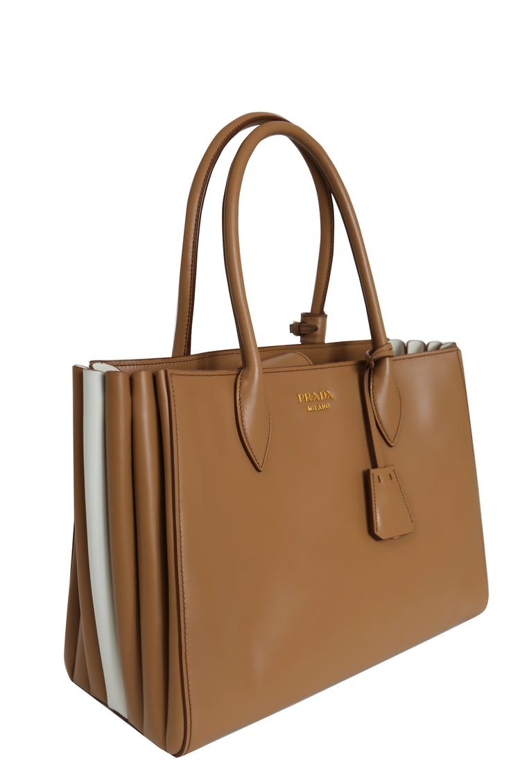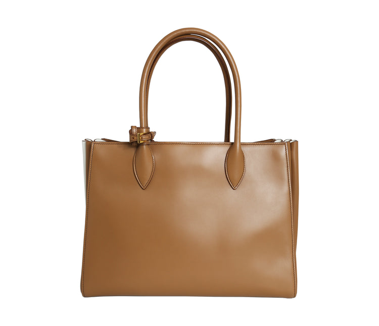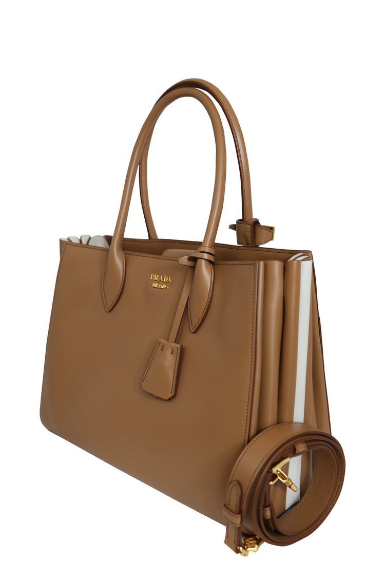 This Prada City Calf tote bag is expertly crafted from smooth calfskin leather in a warm caramel colour with talc accents. Versatile and chic, it comes with a long strap for easy wear and is brand new.