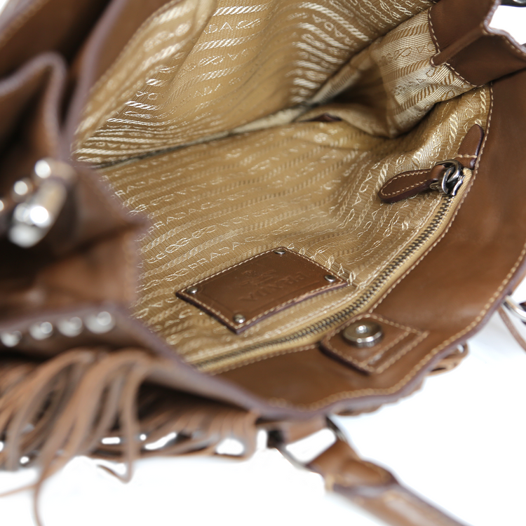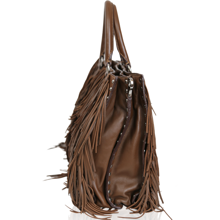 Prada fringe medium tote bag in espresso brown Nappa leather. It opens with two magnetic buttons on top and is divided into two compartments. Lined in dark brown nylon with one zipper pocket against the back. It also comes with an adjustable and detachable shoulder strap. This piece was featured on the Prada 2007 Spring Ready-to-Wear collection runway.