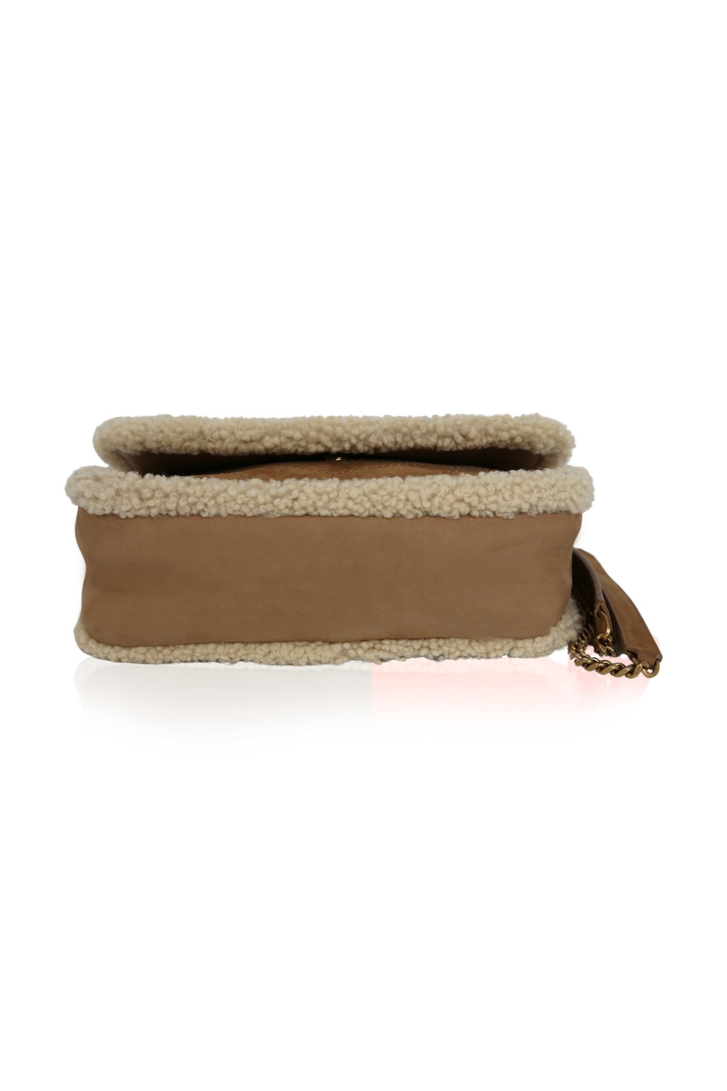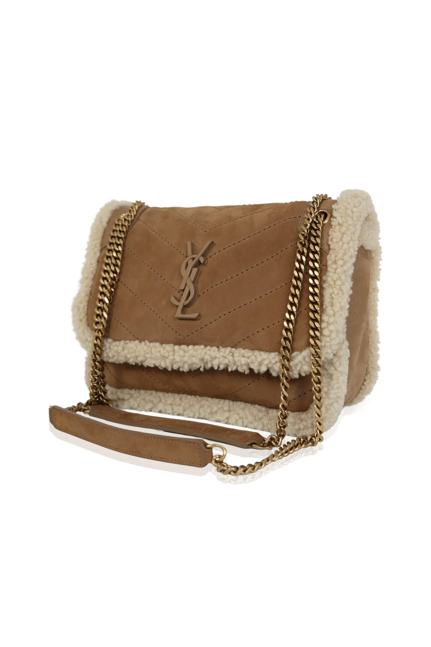 Introducing the Niki Medium Shearling-Trim Bag from Anthony Vaccarello's Fall/Winter 2021 collection. This luxurious bag features a flap with magnetic snap closure and shearling trim, along with a sliding chain link shoulder strap and leather handle. The interior is lined with suede and includes a single pocket. With its elegant design and high-quality craftsmanship, this bag is the perfect accessory for any fashion-forward individual. Made in Italy with antique gold hardware.