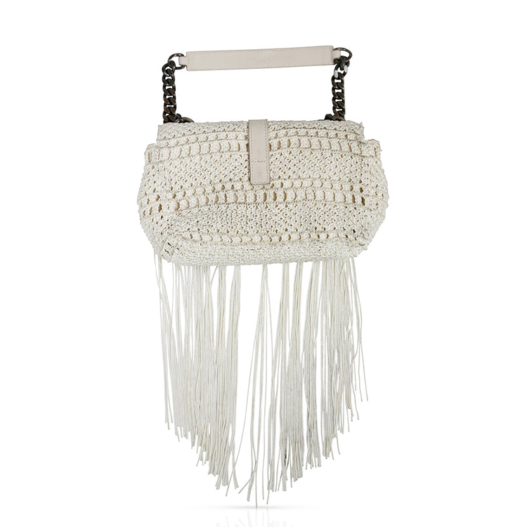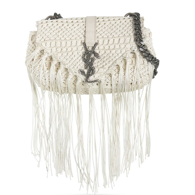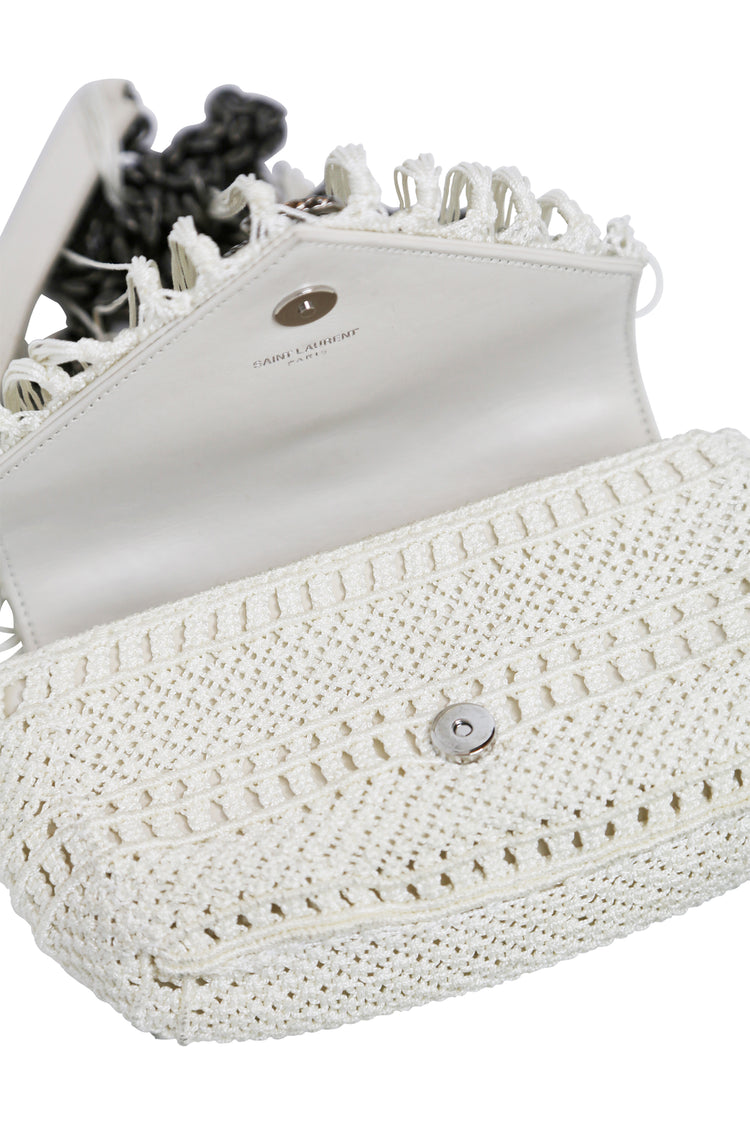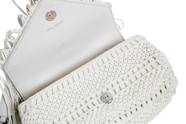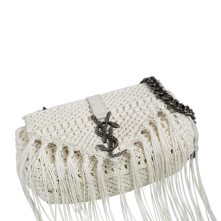 This YSL leather bag features a white crochet design and a snake YSL logo on the front flap. Please be aware that there are minor black marks on the back and front flaps, as well as light black marks on the fringes.