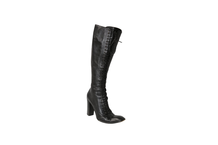 Discover the iconic boots worn by Madonna on the cover of W magazine. These Yves Saint Laurent boots, crafted in Italy from sleek black leather, feature alluring lace detailing that extends to the top. With a subtle zipper designed by Tom Ford, there's no need to continuously untie the corset-like laces. Standing at 4 inches high and 20 inches tall, these boots are the epitome of sophistication.