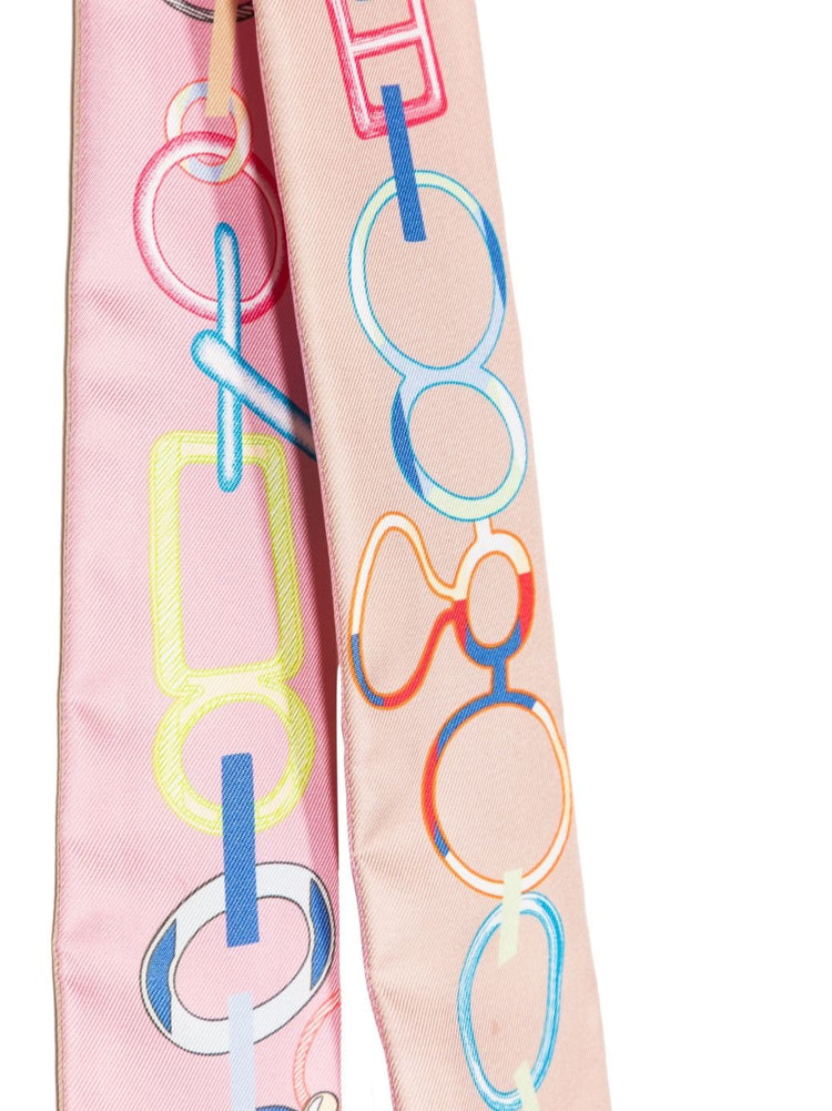 A perfect accessory for any look, the Isola di Primavera Silk Twilly Scarf adds a subtle pop of colour. This light pink, silk scarf features a skinny design, buckle print, and finished edge. Style as a hair accessory or tie to your favourite handbag.
