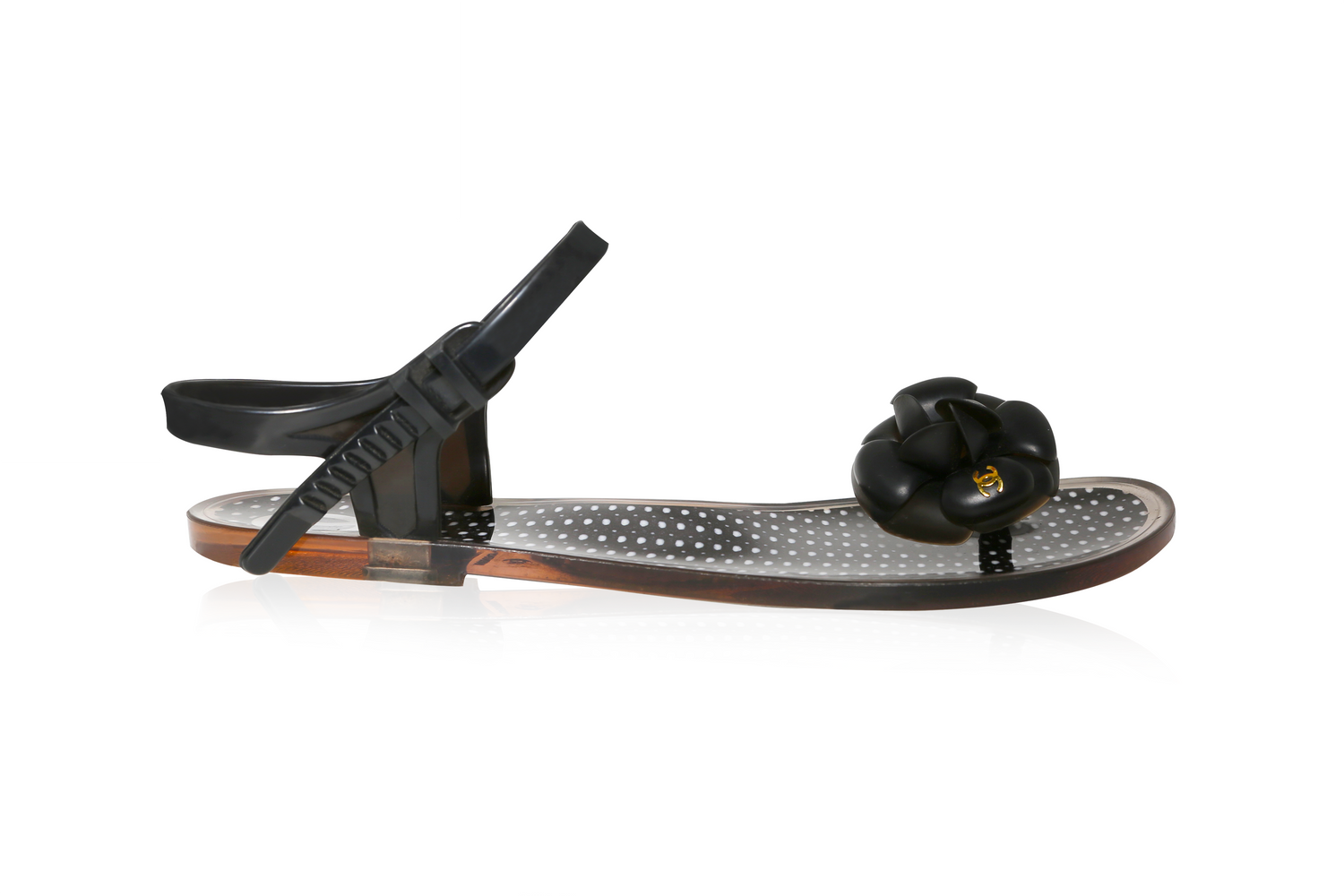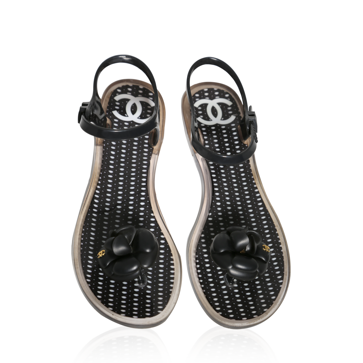 These Chanel sandals showcase a black camellia flower with a gold-tone metal double C logo on one petal. These shoes have been pre-owned; they are in excellent condition, as shown in the pictures.