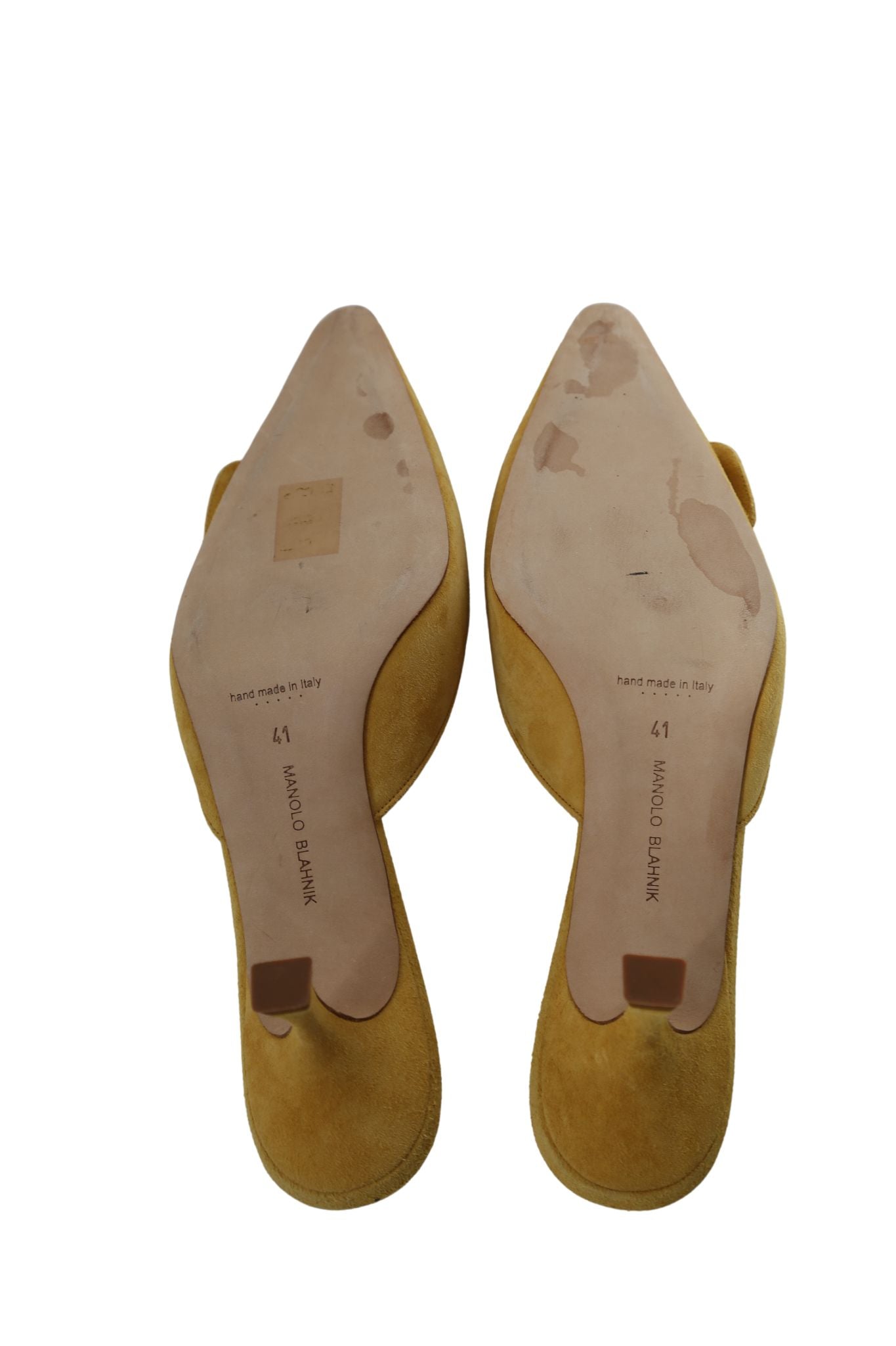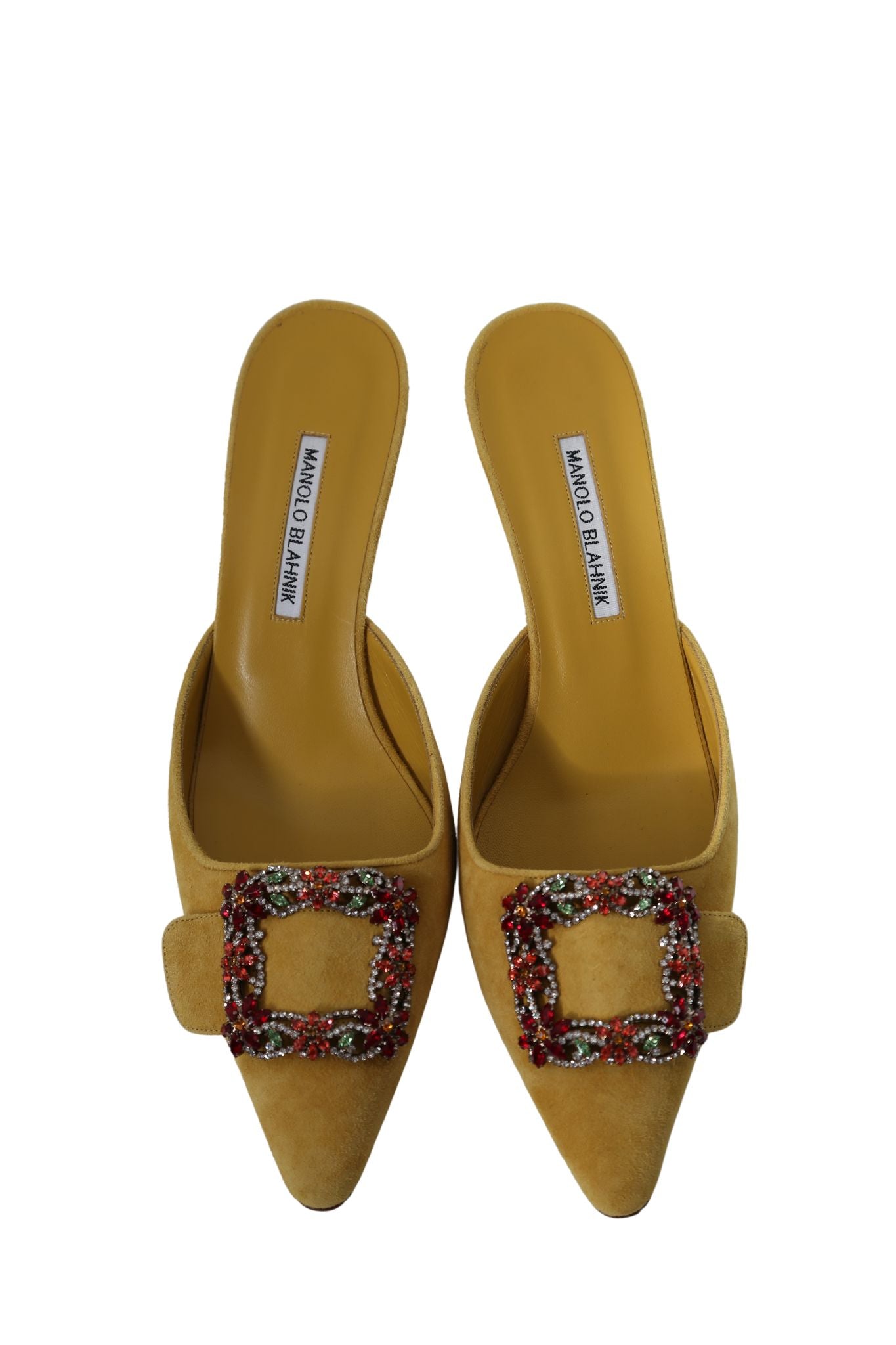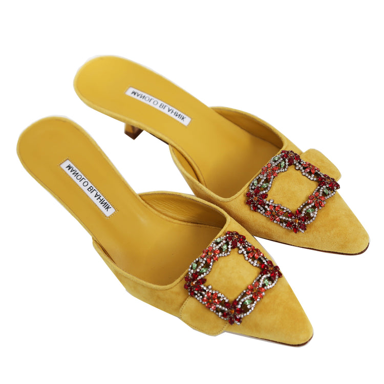 Manolo Blahnik Maysale Yellow Suede Buckle Mules