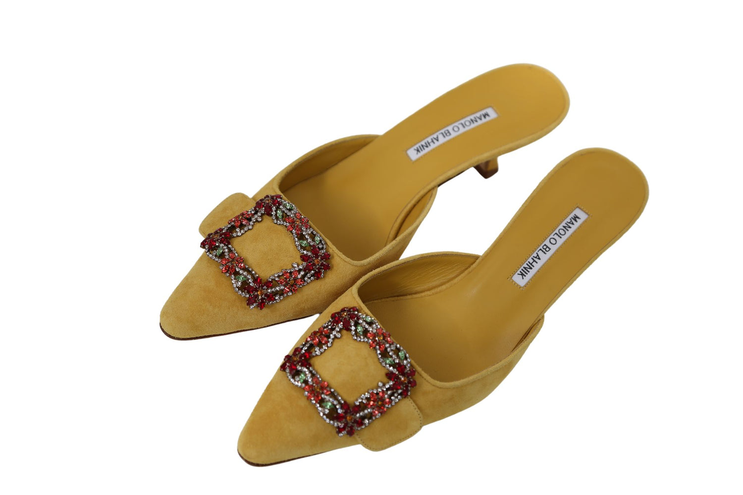 A striking and stylish choice, the Manolo Blahnik Maysale Yellow Suede Buckle Mules feature a stunning decorative buckle embellished with sparkling strass flowers. These luxurious mules also boast a pointed toe and a low, elegant stiletto heel, making them the perfect combination of fashion and comfort.