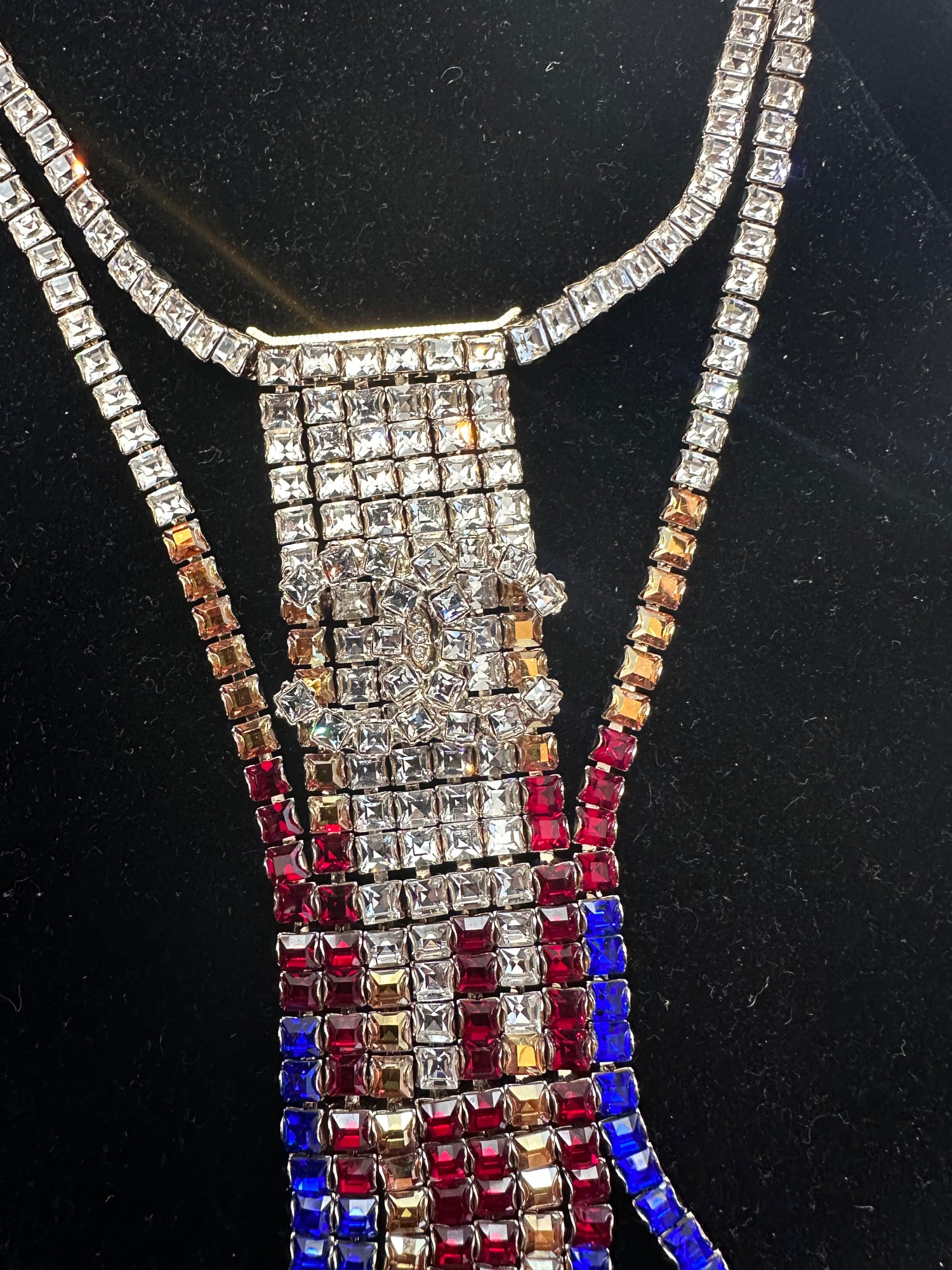 Set in the Temple of Dendur at the Metropolitan Museum of Art in New York City, the Chanel Pre-Fall 2019 runway was a chic mash-up of Ancient Egypt and New York. This rainbow drop statement necklace is artfully embellished with multicoloured rhinestones and the iconic interlocking CC logo. This hard-to-find statement necklace also has a spring-ring fastening and comes complete with the original box.