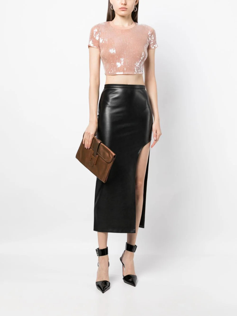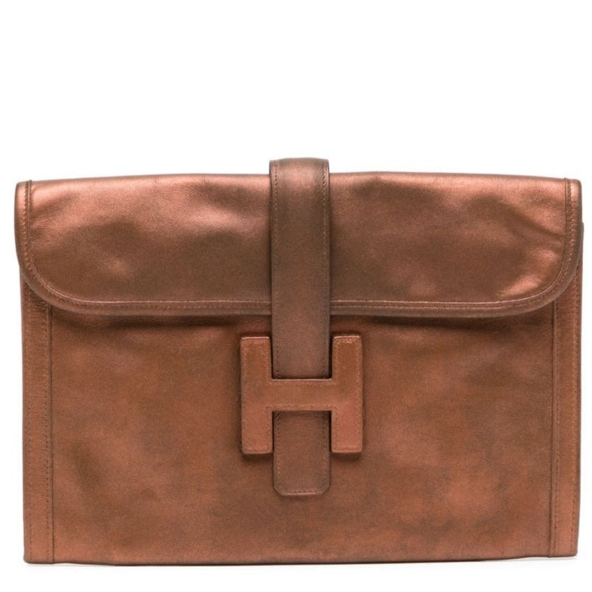 Available in four different sizes, Hermès’ Jige Elan clutch is an ode to practical and minimal design. This iteration is crafted from bronze-tone calf leather with a spacious interior and an H logo on the front.