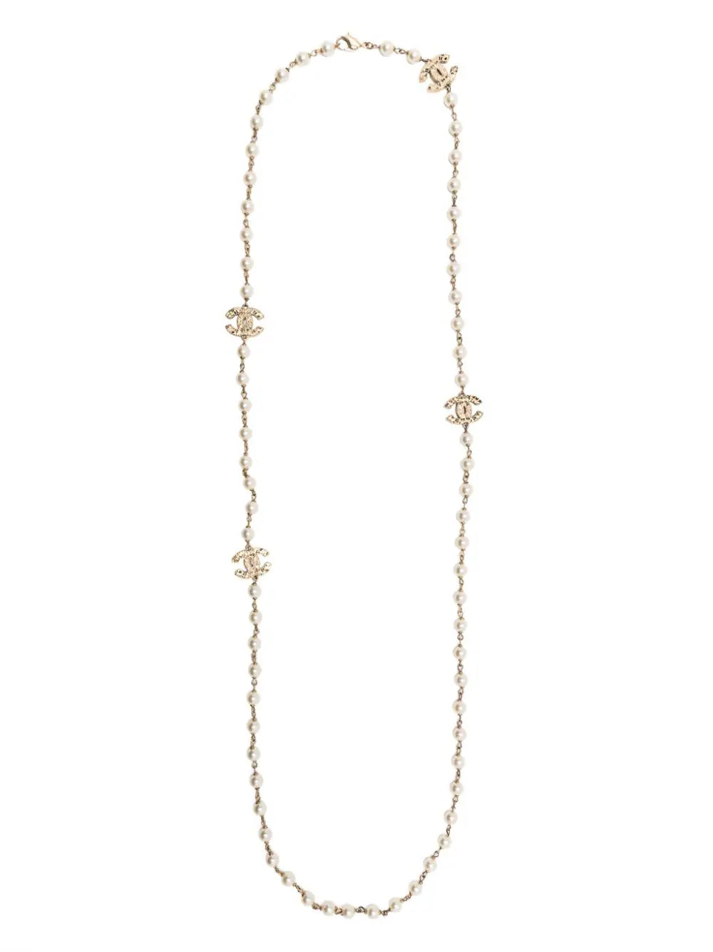 This vintage Chanel necklace features lustrous pearls and the iconic interlocking CC logo. Crafted with silver pleating, it exudes timeless elegance. Elevate any outfit with this statement piece.