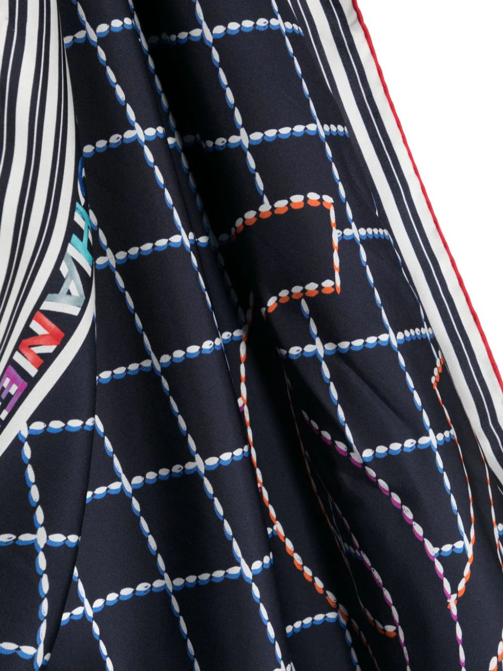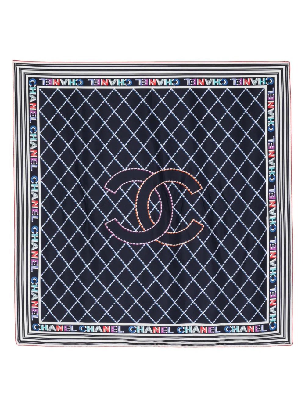 Fashioned with a modern wiring print, this pure silk Chanel scarf is presented in contrasting multicolours, featuring finished edges, a long length, and an all-over print.
