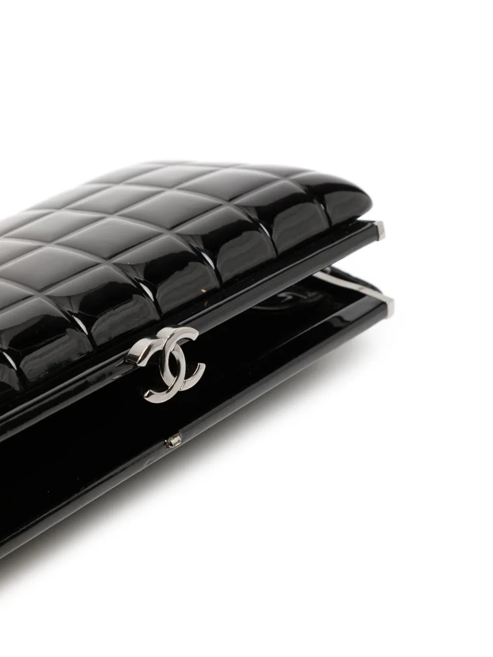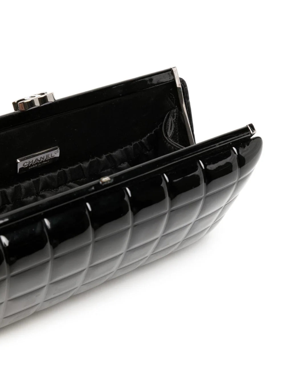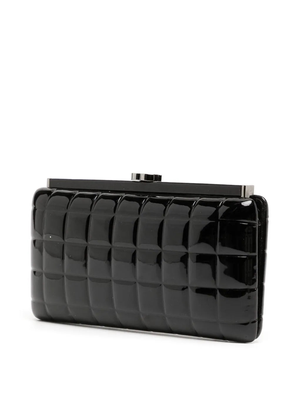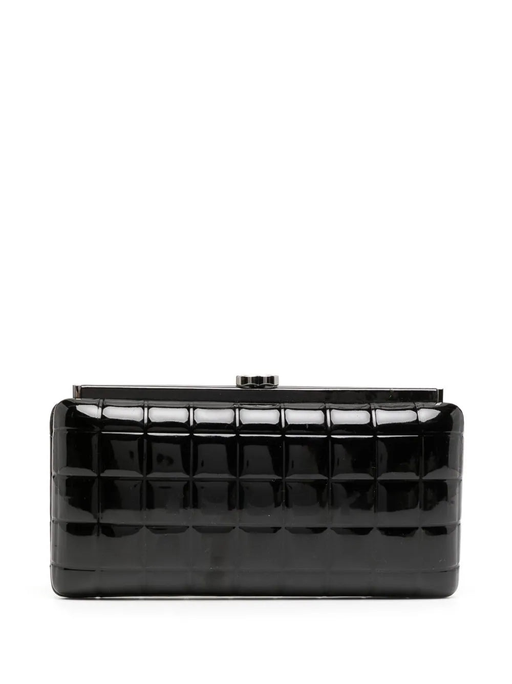 One of CHANEL's most recognizable features, after its iconic interlocking CC logo, is its diamond quilt. The Choco Bar quilt comes in second place and is showcased on this timeless black clutch bag.