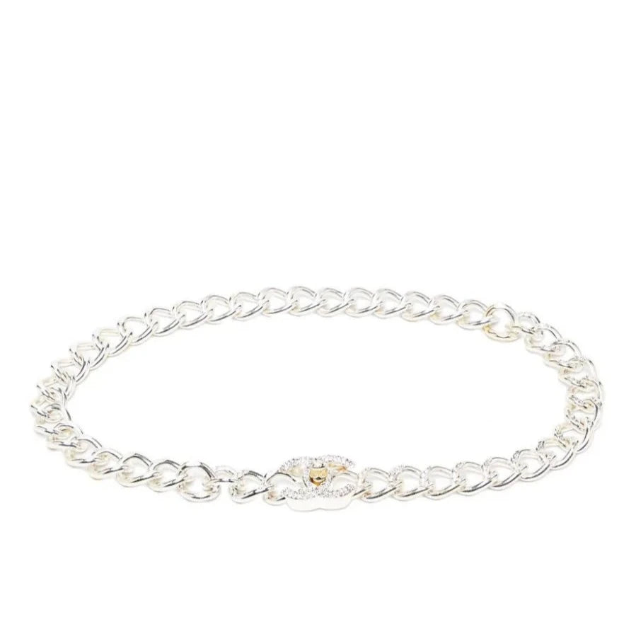 Crafted with a silver pleated design, this chain crystal turn-lock belt adds a touch of elegance to your look. Perfect for formal occasions or adding a touch of glamour to your everyday style.