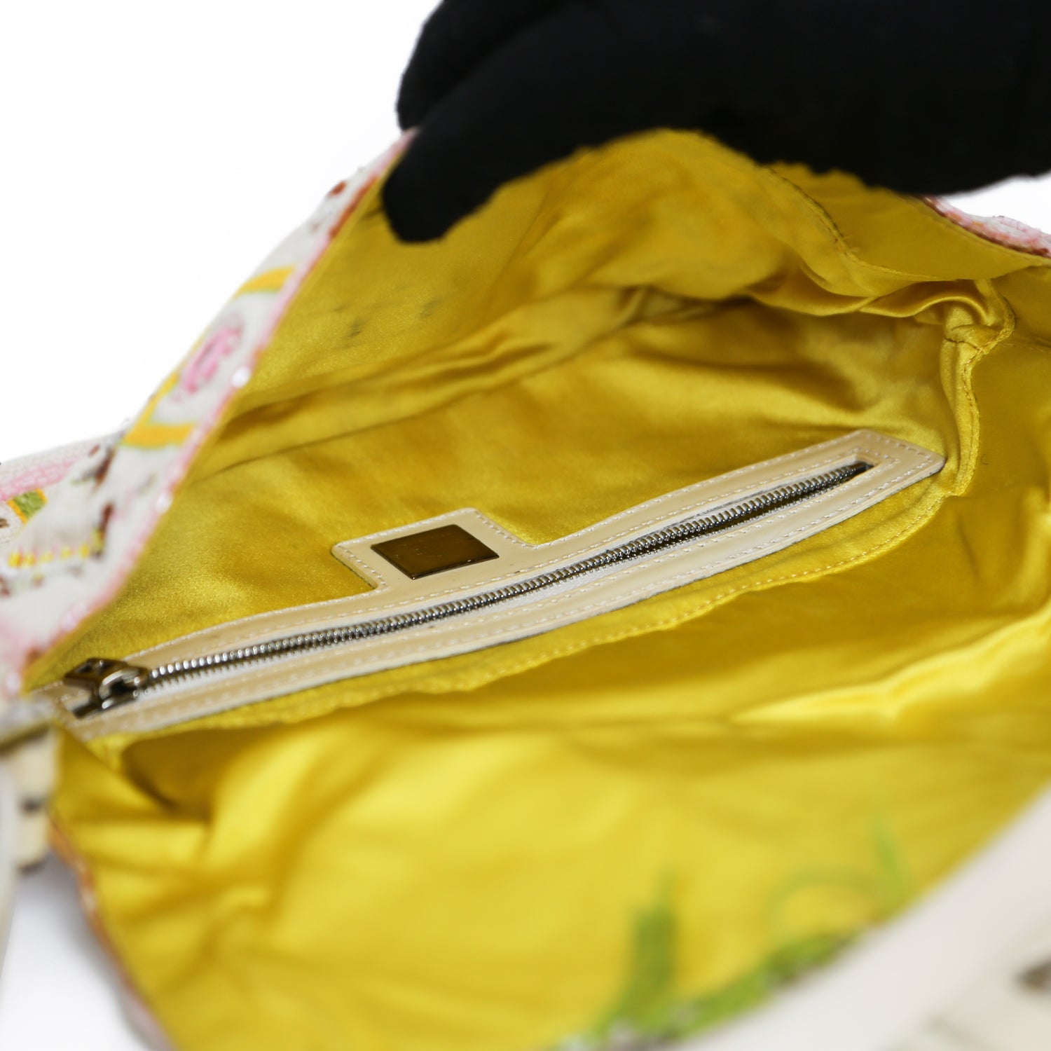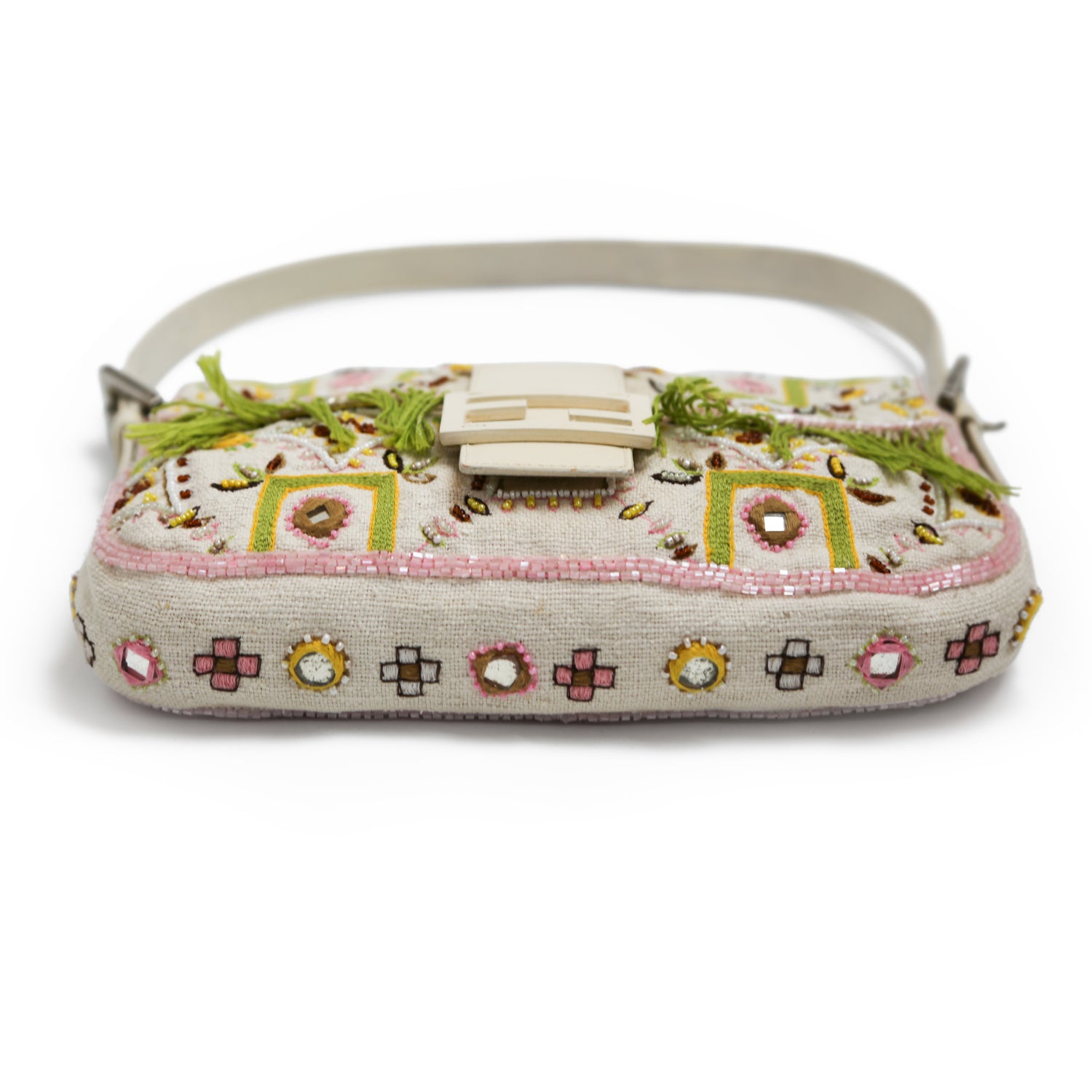As the most classic handbag from Fendi, this Fringed Cut-out Baguette shoulder bag is a must-have for any fashionista. Meant to be worn snugly under the arm—it was inspired by Parisians carrying their baguettes home from the baker. The design was a deliberate move by Silvia Venturini Fendi away from the larger sizes and utilitarian designs that were trending at the time. This baguette features beautiful embroidery and small mirrors, making it a unique and eye-catching accessory.