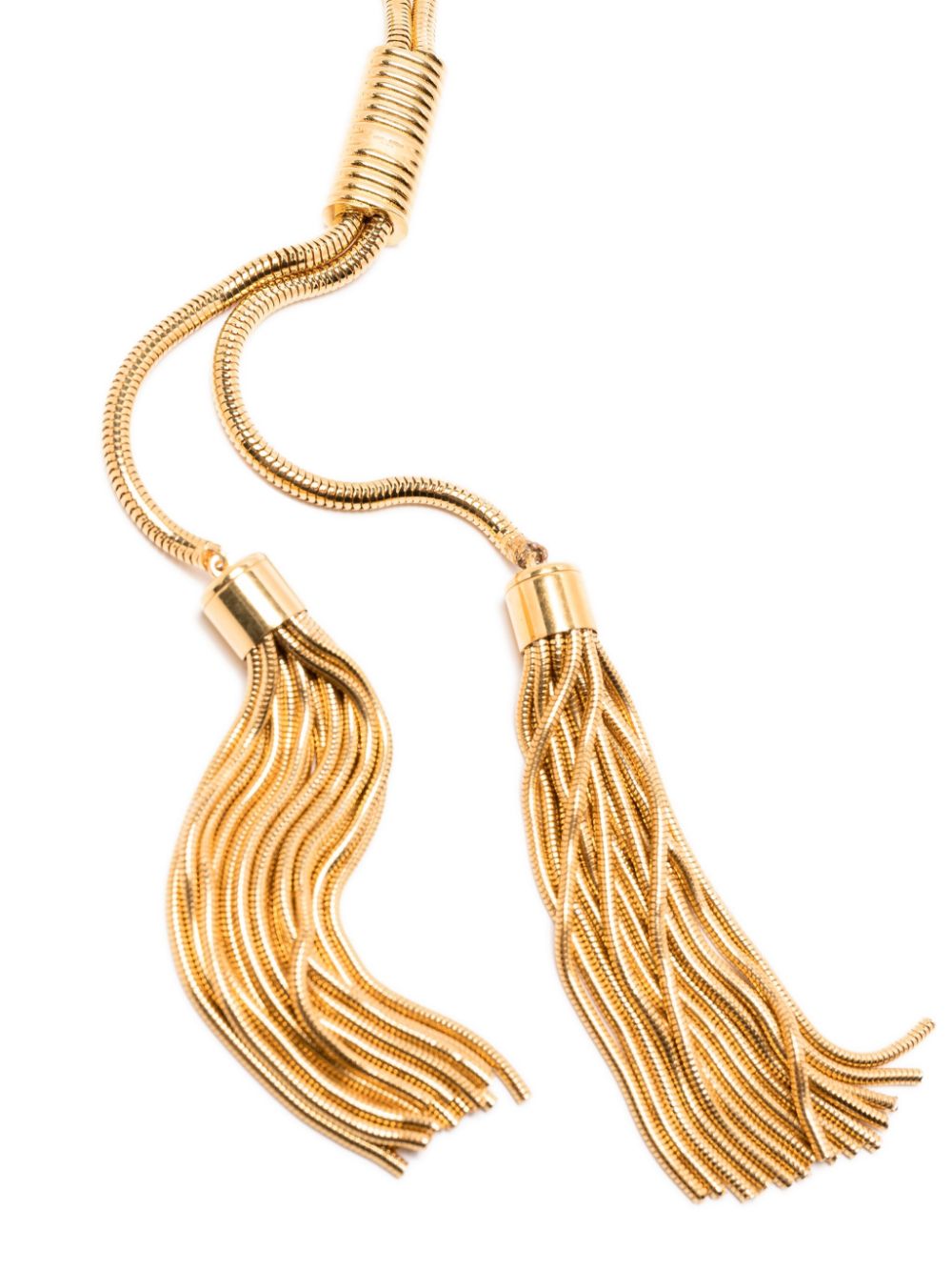 This vintage Saint Laurent necklace features a gleaming gold tone and a unique tassel design that adds a touch of elegance. With a secure fastening, you can confidently wear this YSL statement piece for any occasion. Perfect for both casual and formal attire.