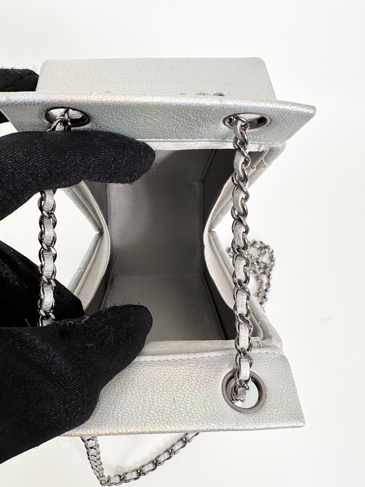 Got milk? This incredibly rare and limited edition Chanel milk carton bag derives from one of Karl Lagerfeld's most infamous runways of all time, the supermarket emporium of autumn/winter 2014. Its iridescent silver leather is detailed with quilted side panels, and reads lait de Coco across its front in pearls, crystals strass and silver-tone metal. To be worn shoulder-slung from Chanel's signature leather-threaded chain strap, in white. Groceries have never looked so chic.
