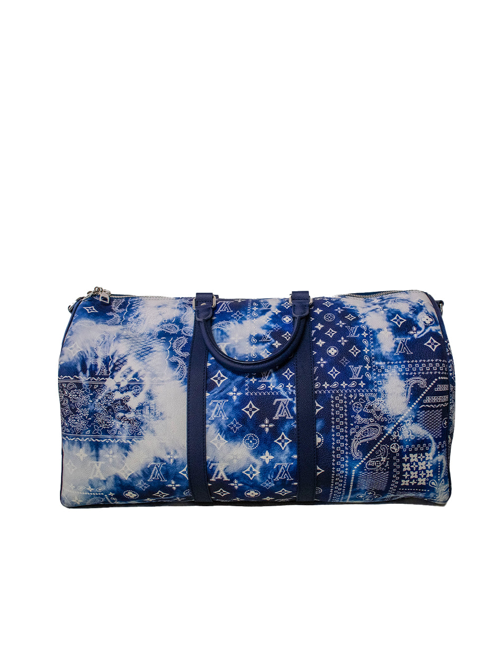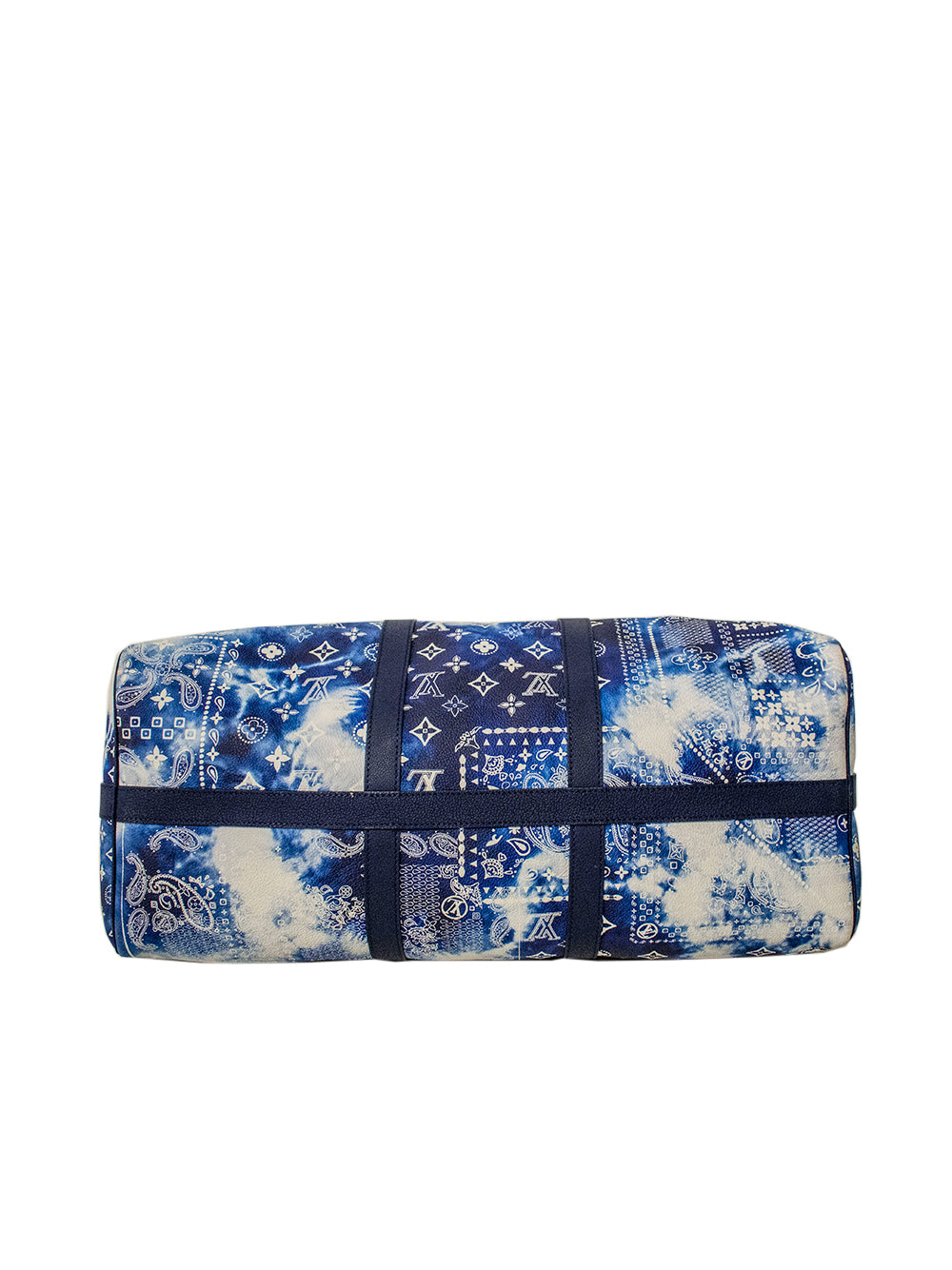 An exclusive edition of Louis Vuitton's Cowhide Monogram Bandana City Keepall, the Keepall 50 in Bleached Blue is a sophisticated statement piece. Made of premium cowhide leather, this spacious tote boasts a stylish paisley print with iconic LV monogram motifs. The top opens to a fabric-lined interior with convenient zip and patch pockets.