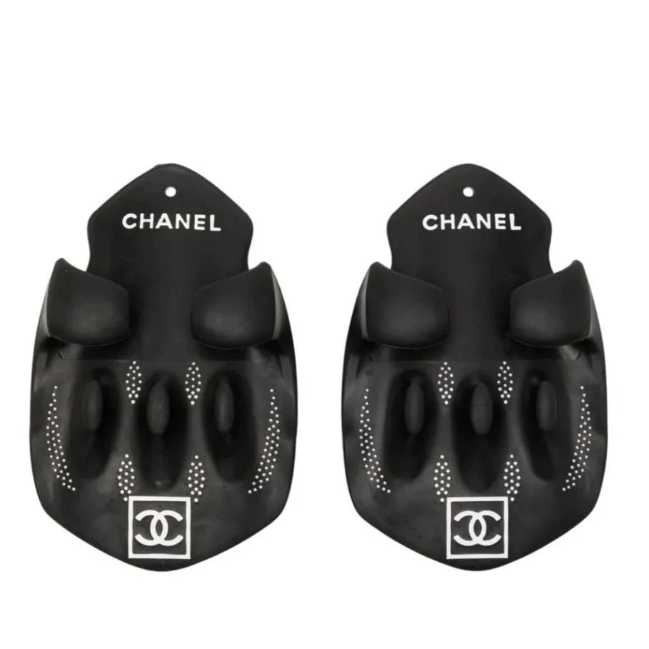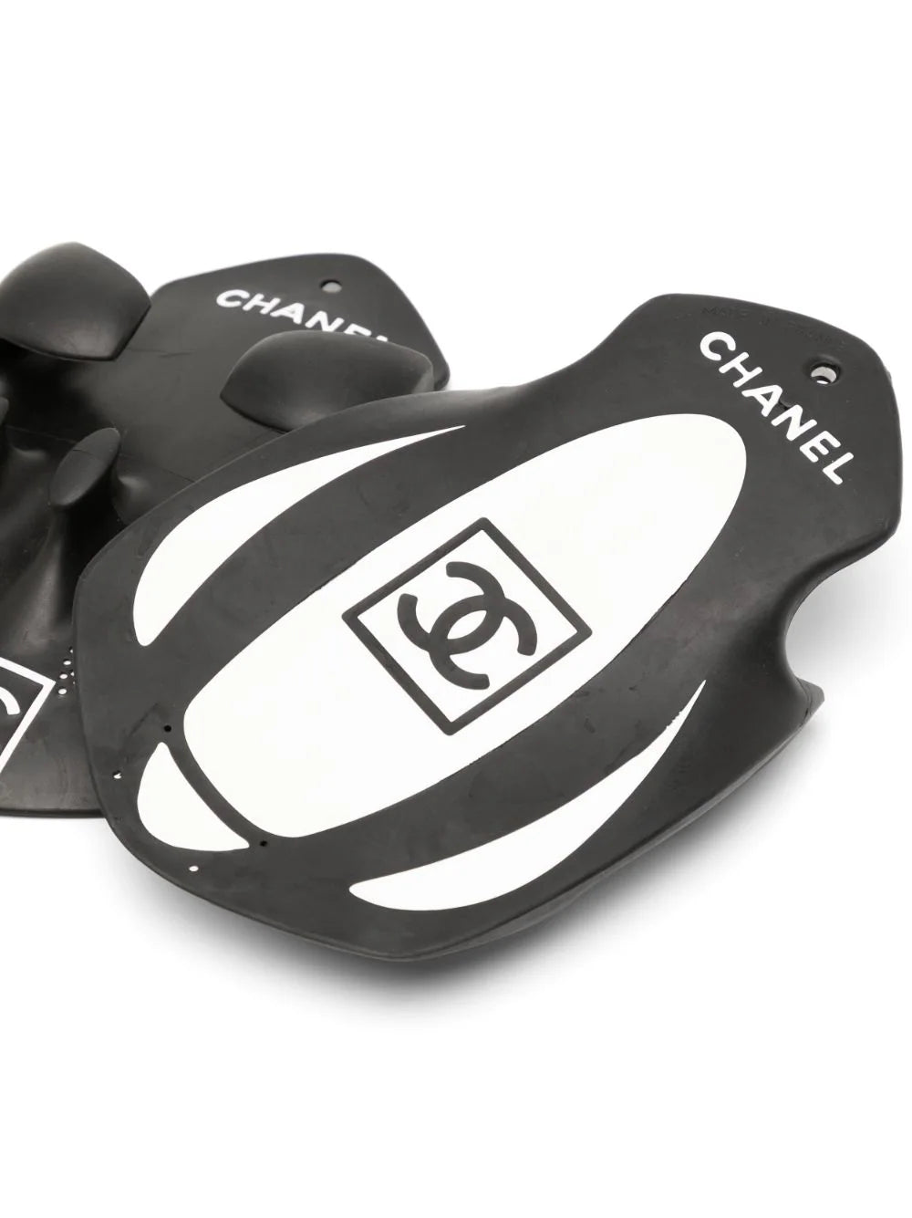 Crafted in France from a blend of charcoal black synthetic rubber and Thermoplastic Polyurethane, this pair of pre-owned, limited edition swimming peddlers by Chanel features its iconic interlocking CC logo and 'Chanel' motif on both the front and rear, with contrasting off-white details and a textured style to provide an elegant touch. Authenticated by our in-house experts, this pre-owned Chanel item is a registered trademark of Chanel, unaffiliated with Rewind.