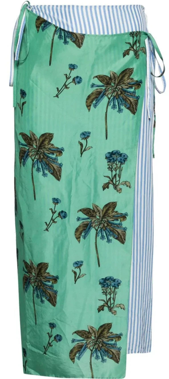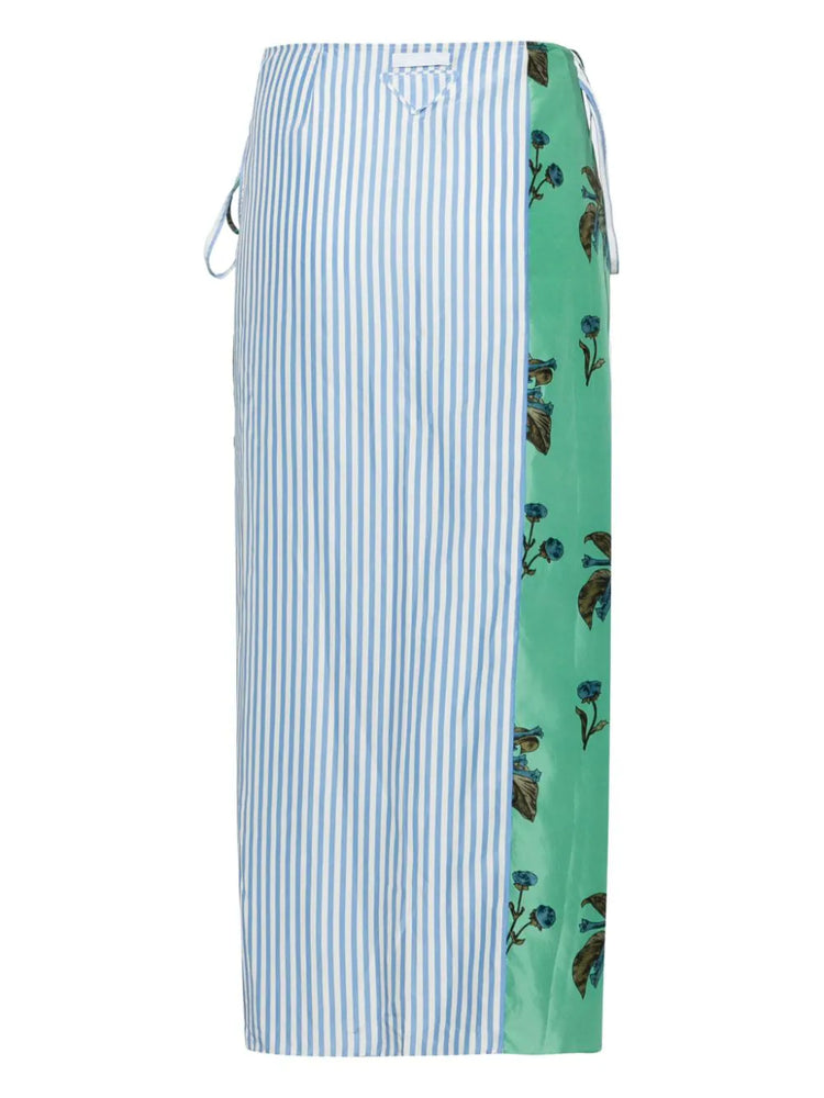 Expertly crafted by Prada, this wraparound skirt features a vibrant floral pattern, accented by a bold black panel with white and blue stripes. Made of luxurious 100% silk, it ties at the waist for the perfect fit. It is a timeless addition to any wardrobe.