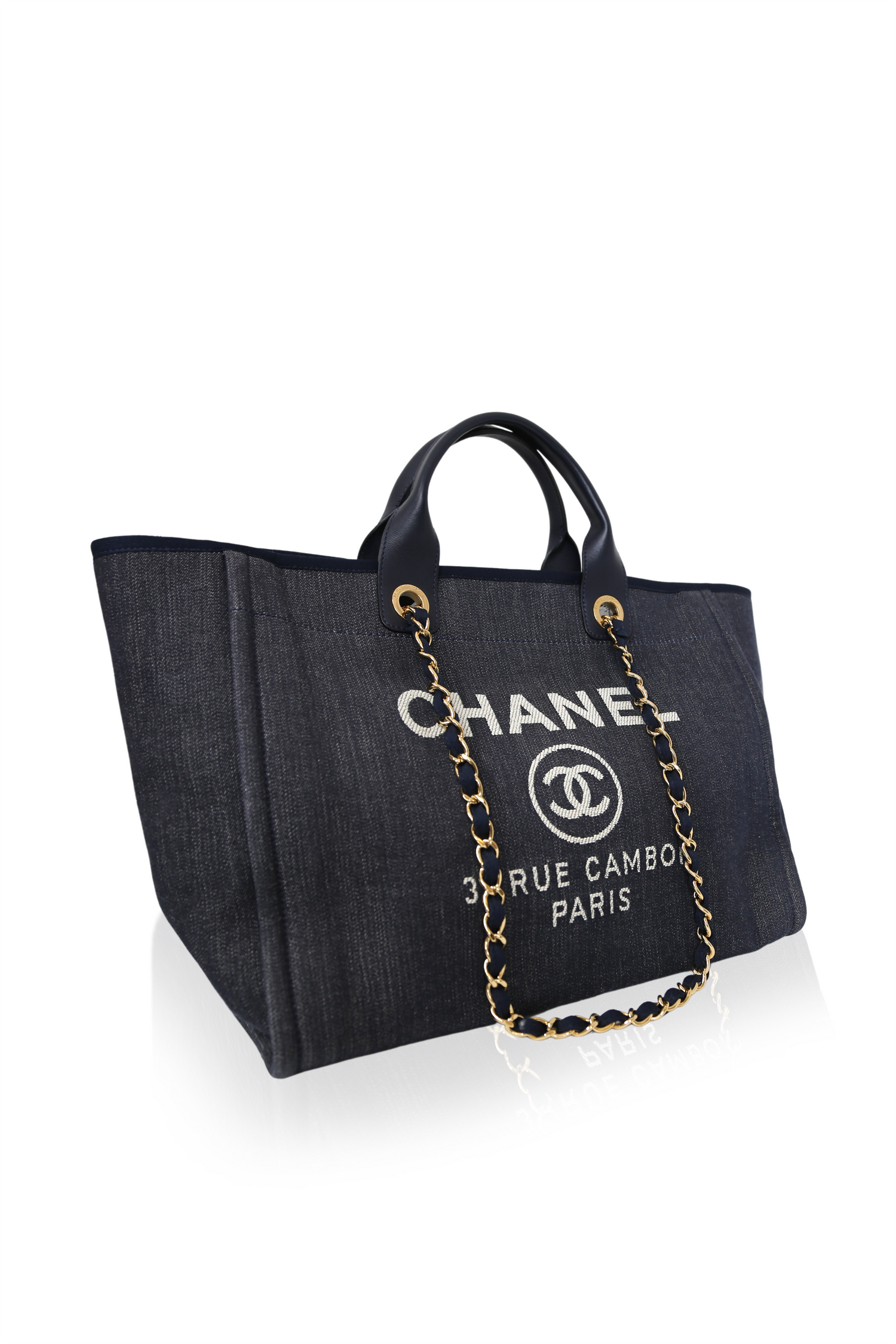 This pre-owned Chanel XL Blue Deauville Tote bag is a spacious lightweight bag for any Chanel lover. Crafted in Paris from blue denim toned canvas, the oversized bag features leather handles and a woven-in chain link shoulder strap. The bag has a magnetic snap closure that opens to interior pockets, perfect for all your essentials. The Deauville is great for everyday wear or as a weekend bag.