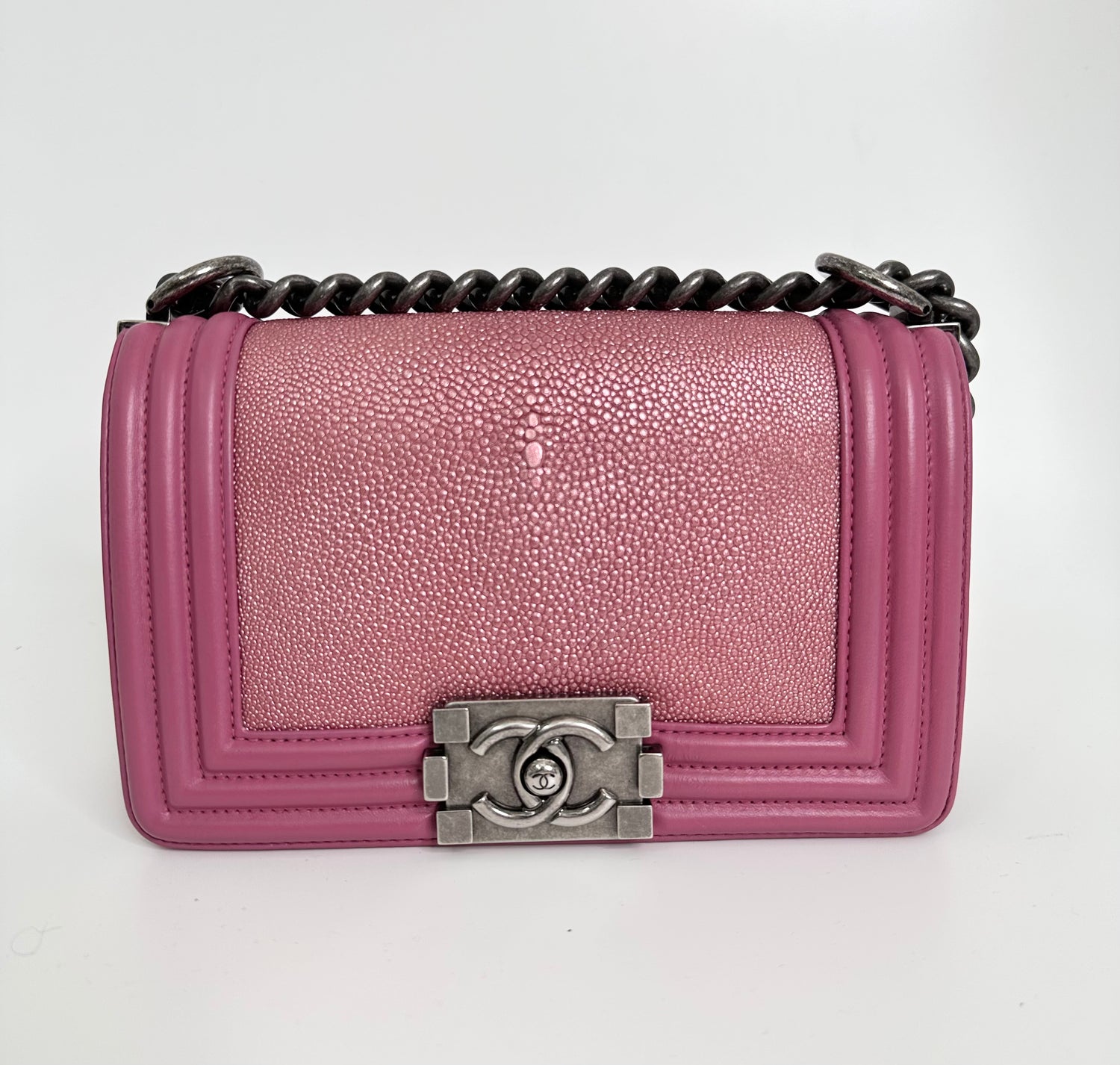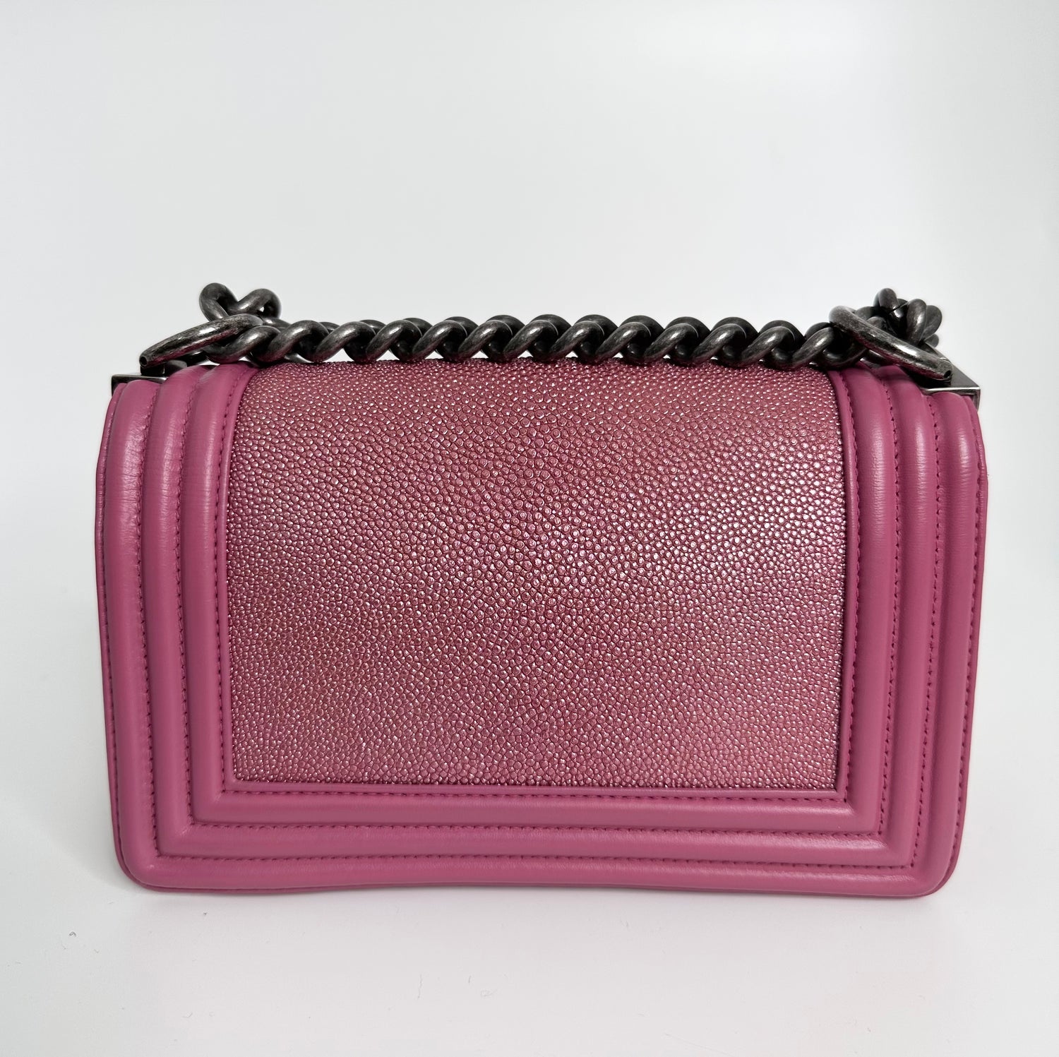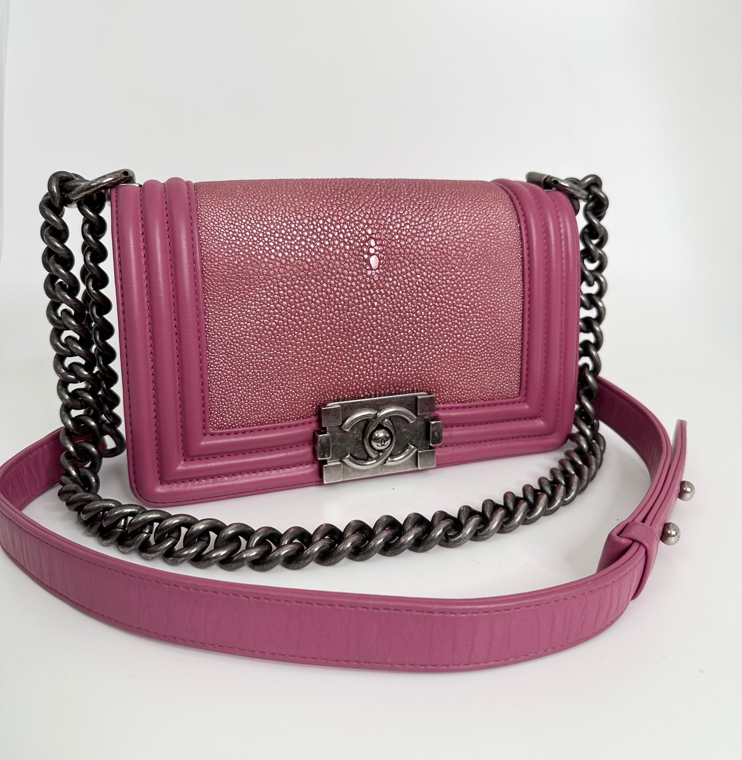 Inspired by a cartridge bag, made for hunters, the Chanel Boy bag has become one of the true iconic bags of the French fashion house. With a modern edgy twist, this pre-owned bag from 2012 has been crafted from galuchat leather. Surrounded by a smooth leather trim, the bag features a push-lock closure embossed with the signature interlocking 'CC' logo. Though compact in size, it has a large interior with one zip pocket, perfect for storing all your loose items. The gunmetal grey and leather chain strap can be adjusted to wear crossbody or thrown on your shoulder. A must-have for every Chanel lover, we are struggling to think of outfits this won't work with.