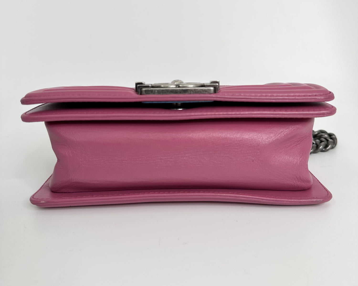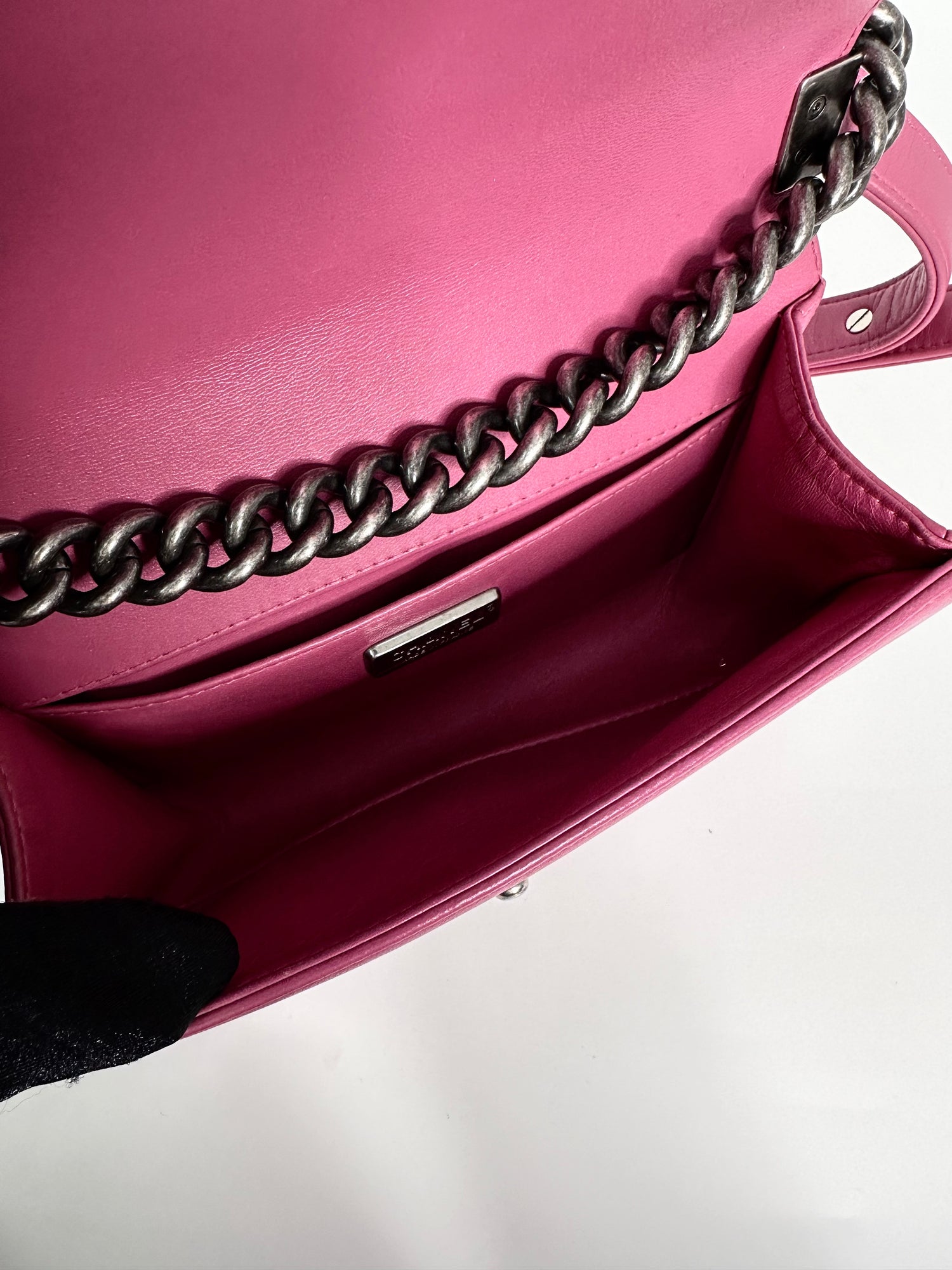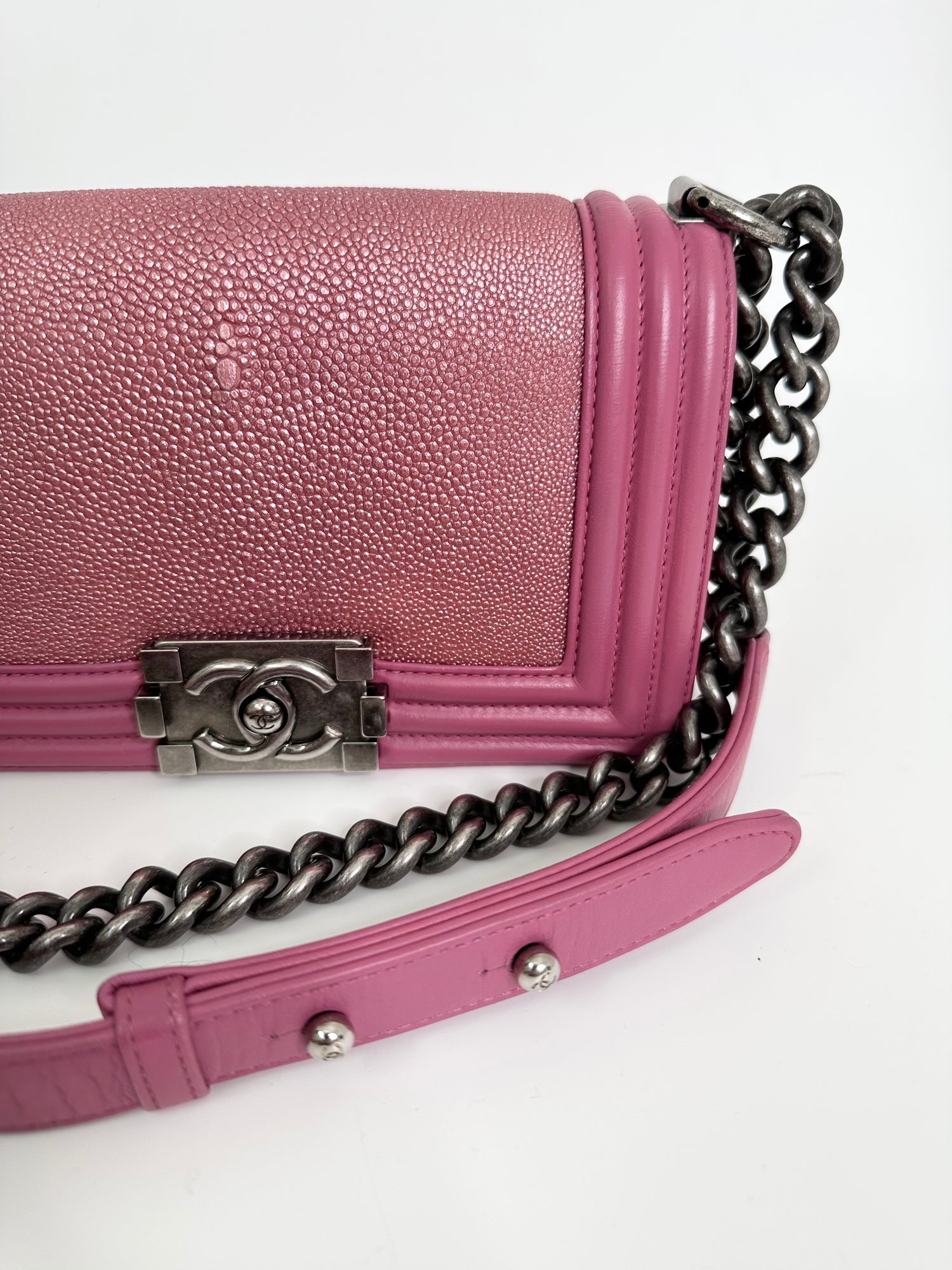 Inspired by a cartridge bag, made for hunters, the Chanel Boy bag has become one of the true iconic bags of the French fashion house. With a modern edgy twist, this pre-owned bag from 2012 has been crafted from galuchat leather. Surrounded by a smooth leather trim, the bag features a push-lock closure embossed with the signature interlocking 'CC' logo. Though compact in size, it has a large interior with one zip pocket, perfect for storing all your loose items. The gunmetal grey and leather chain strap can be adjusted to wear crossbody or thrown on your shoulder. A must-have for every Chanel lover, we are struggling to think of outfits this won't work with.