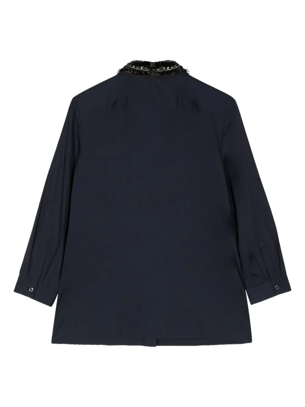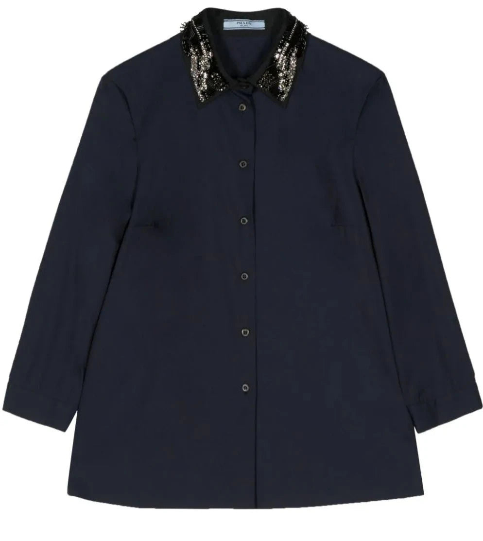 Upgrade your wardrobe with the elegant and luxurious jewelled shirt from Prada. Made with 100% cotton, this navy top is both comfortable and stylish. Its jewel embellishments add a touch of glamour, making it perfect for any special occasion. Don't miss out on this excellent-condition piece from a renowned fashion brand.