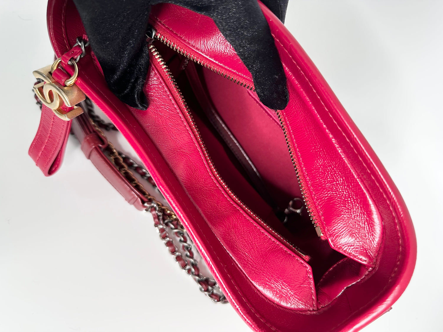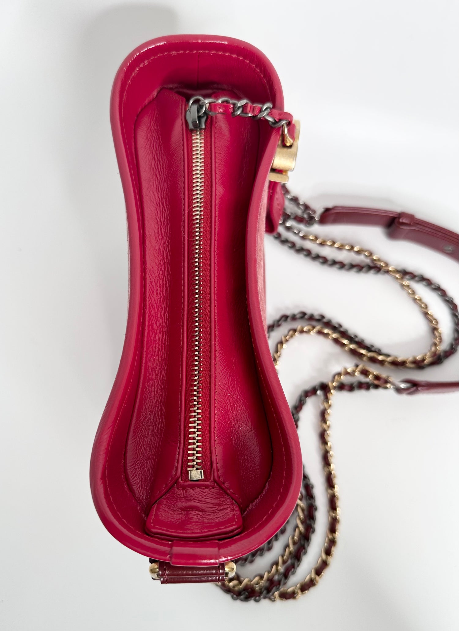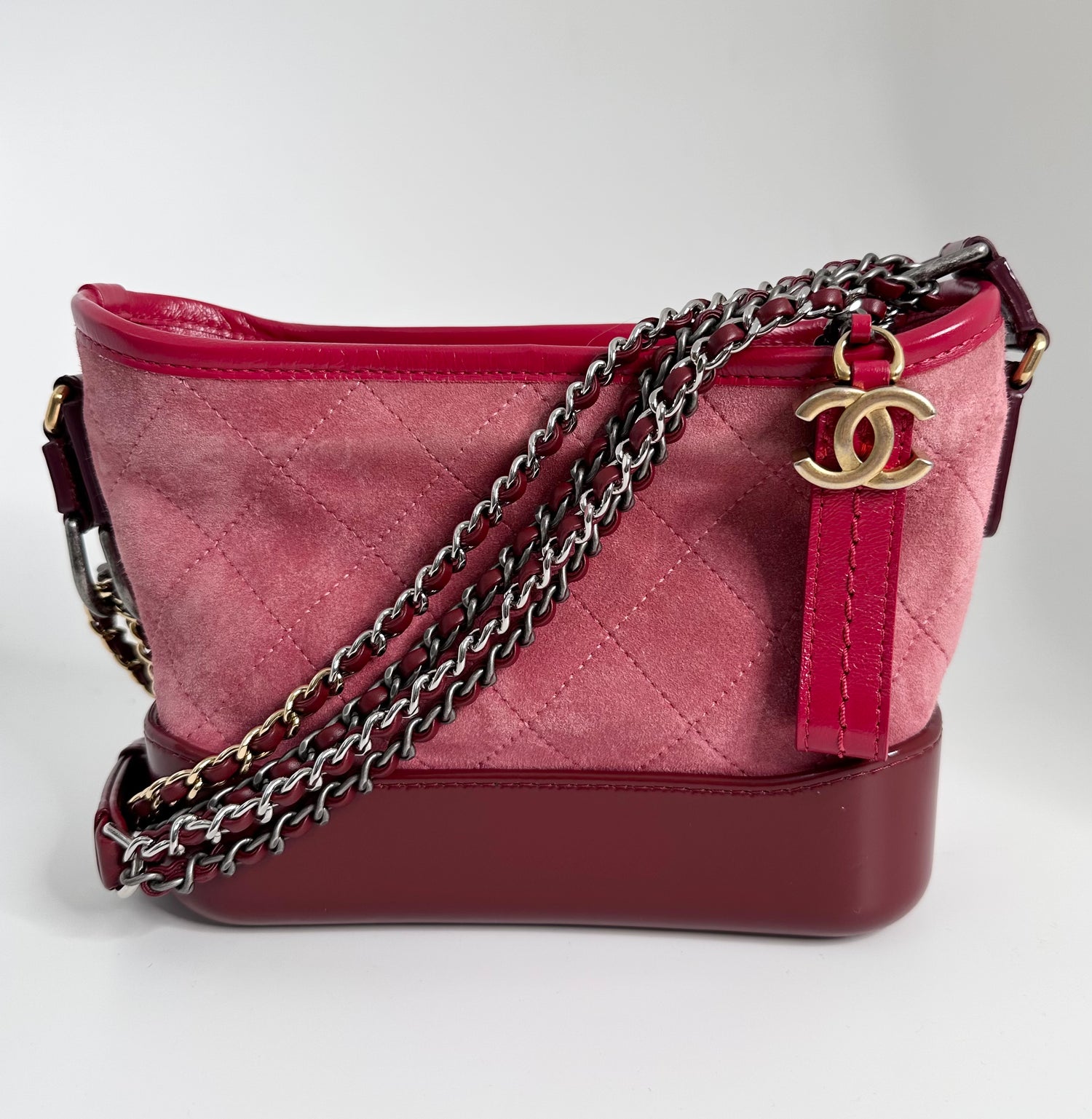 The Chanel Gabrielle bag was first introduced in 2017, and is said to take inspiration from virtual reality glasses with an effortlessly cool, contemporary style. Featuring diamond stitched suede leather in red and a matching calfskin base, this pre-owned bag opens to a spacious deep red interior with patch pockets. Perfect for holding all your daily essentials!