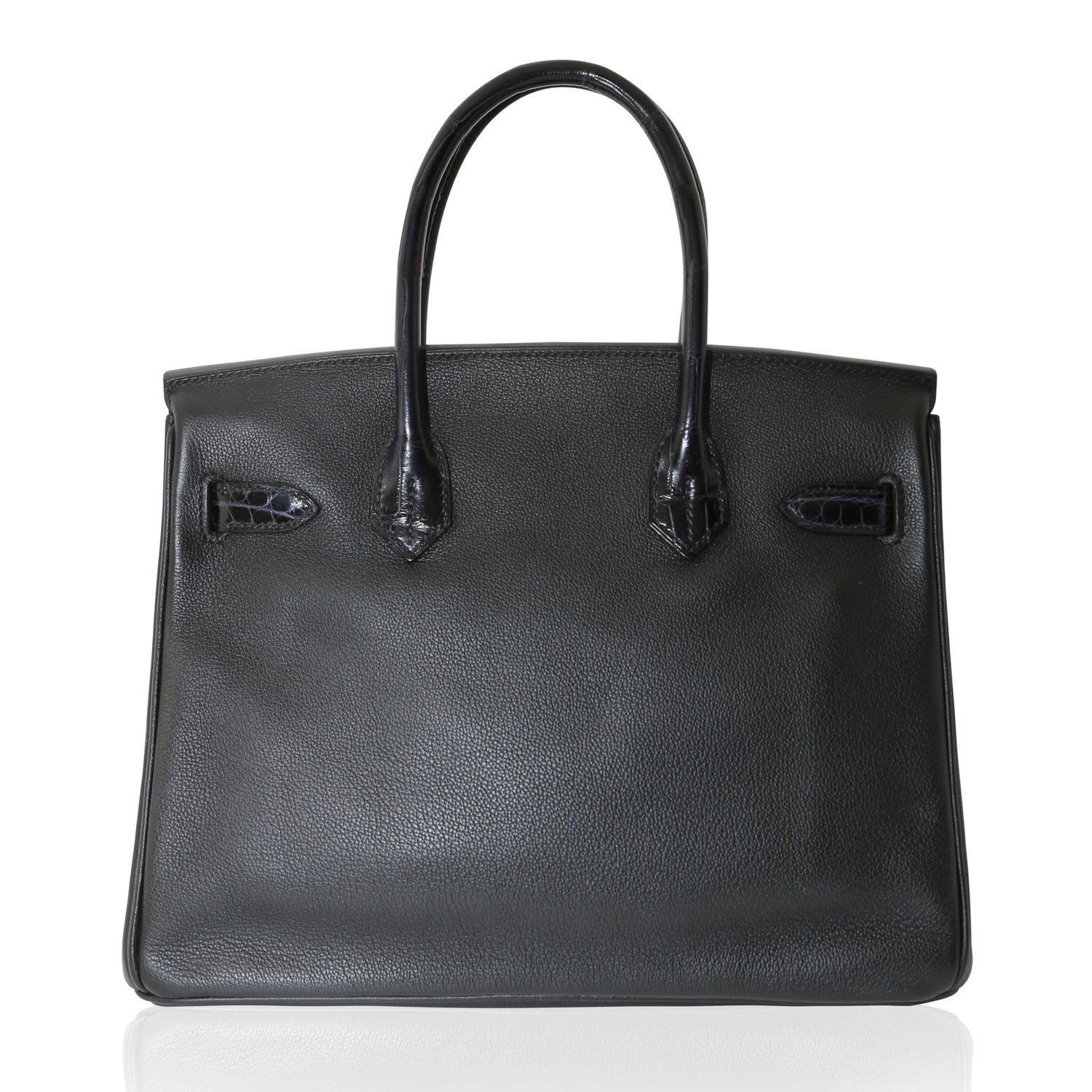 The Hermès Touch Birkin 30 cm bag boasts a stunning exterior, featuring noir Taurillon Novillo and bleu marine Niloticus lisse leather with palladium hardware. The exterior is complemented by tonal stitching, two straps with a front toggle closure, and double-rolled croc handles. Inside, the bag is lined with noir Taurillon Novillo and includes a zipper pocket with an Hermès engraved zipper pull and an open pocket on the opposite side.