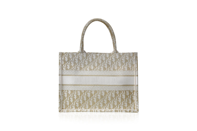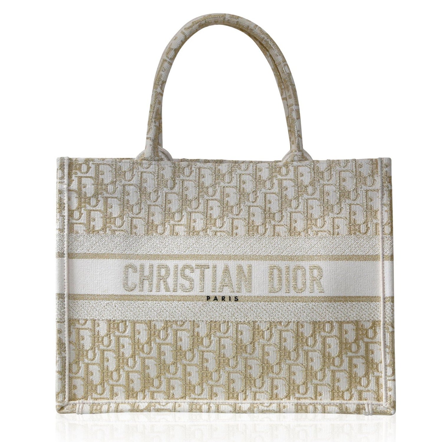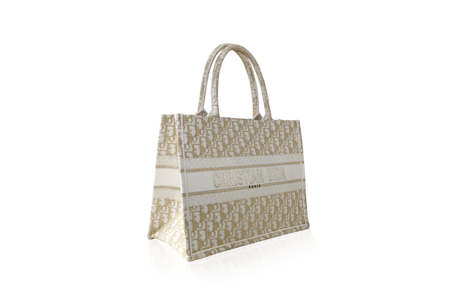 Designed by Maria Grazia Chiuri, Creative Director of Christian Dior, the Dior Book Tote is a must-have for any Dior enthusiast. The medium tote features a white and gold-tone embroidered Dior Oblique motif and is embellished with the Christian Dior Paris signature on the front. This versatile style showcases the brand's renowned expertise and can be carried by hand or worn over the shoulder for optimal functionality.