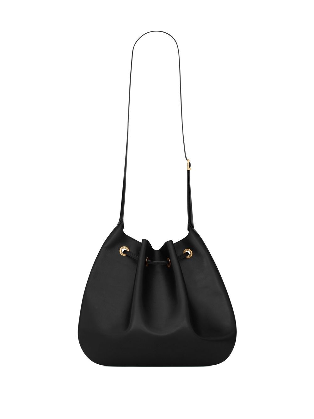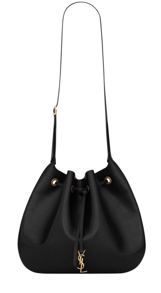 The creation of the iconic Saint Laurent logo is attributed to graphic designer Cassandre in 1961. This Paris VII flat bag, adorned with YSL logos, features a leather drawstring closure and showcases the brand's trademark elegance and refined fashion sense.