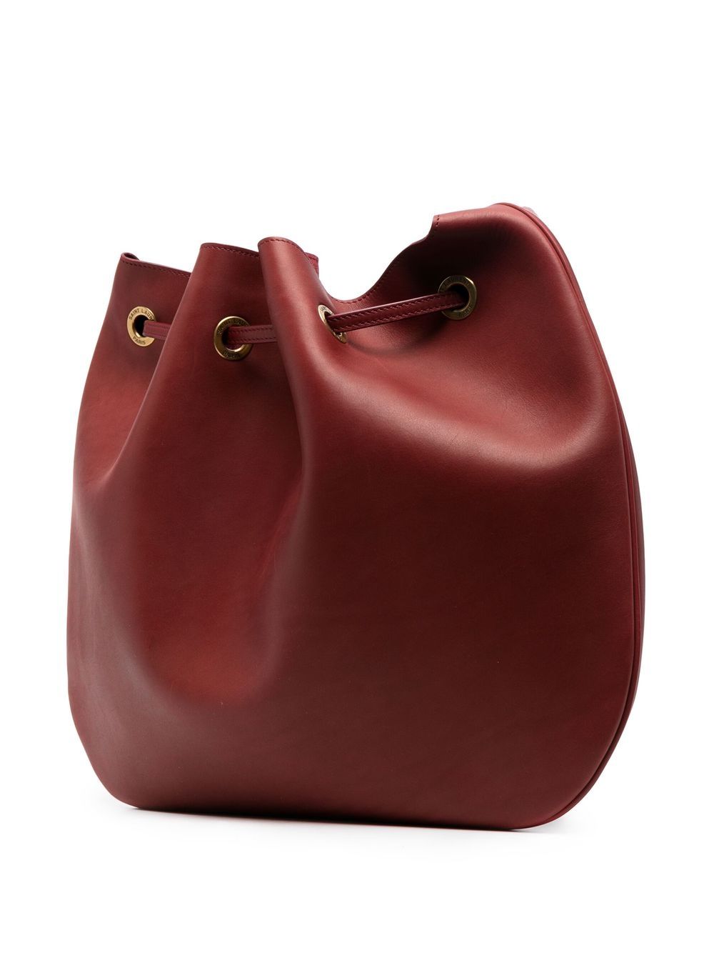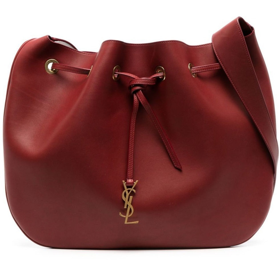 Constructed from sleek red leather in a bucket shape, the Saint Laurent Paris VII bag has been updated to a larger version. The minimalist design is adorned with a golden YSL plaque hanging from the drawstring closure.