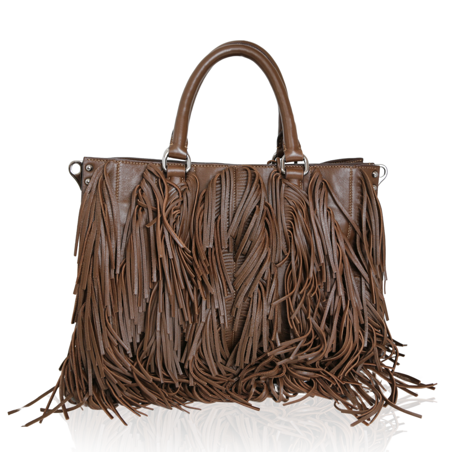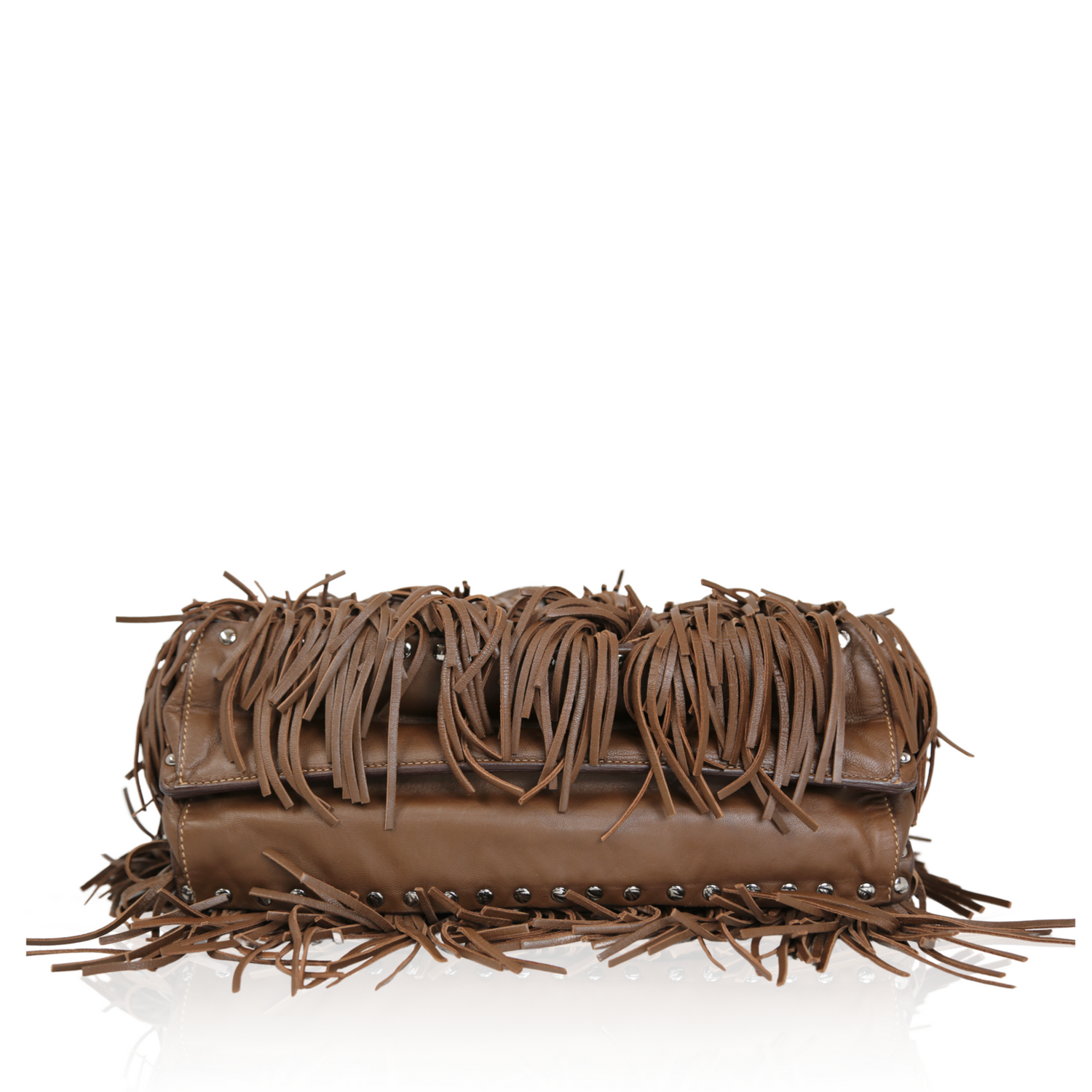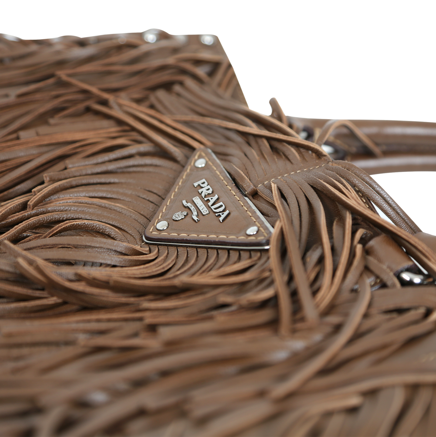 Prada fringe medium tote bag in espresso brown Nappa leather. It opens with two magnetic buttons on top and is divided into two compartments. Lined in dark brown nylon with one zipper pocket against the back. It also comes with an adjustable and detachable shoulder strap. This piece was featured on the Prada 2007 Spring Ready-to-Wear collection runway.