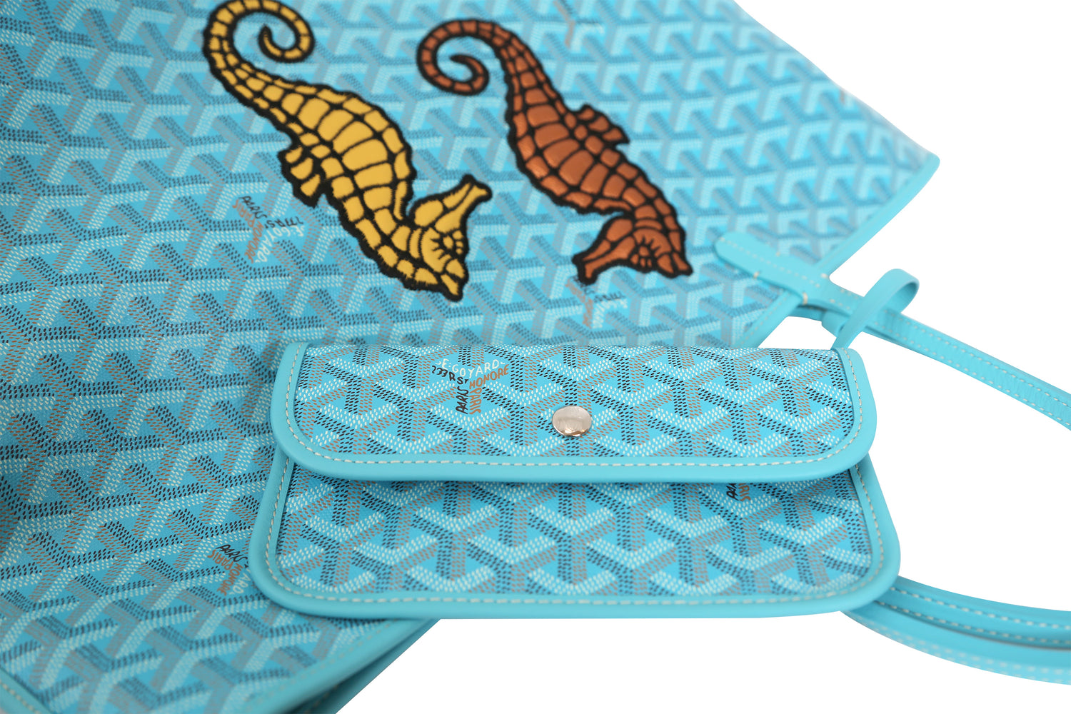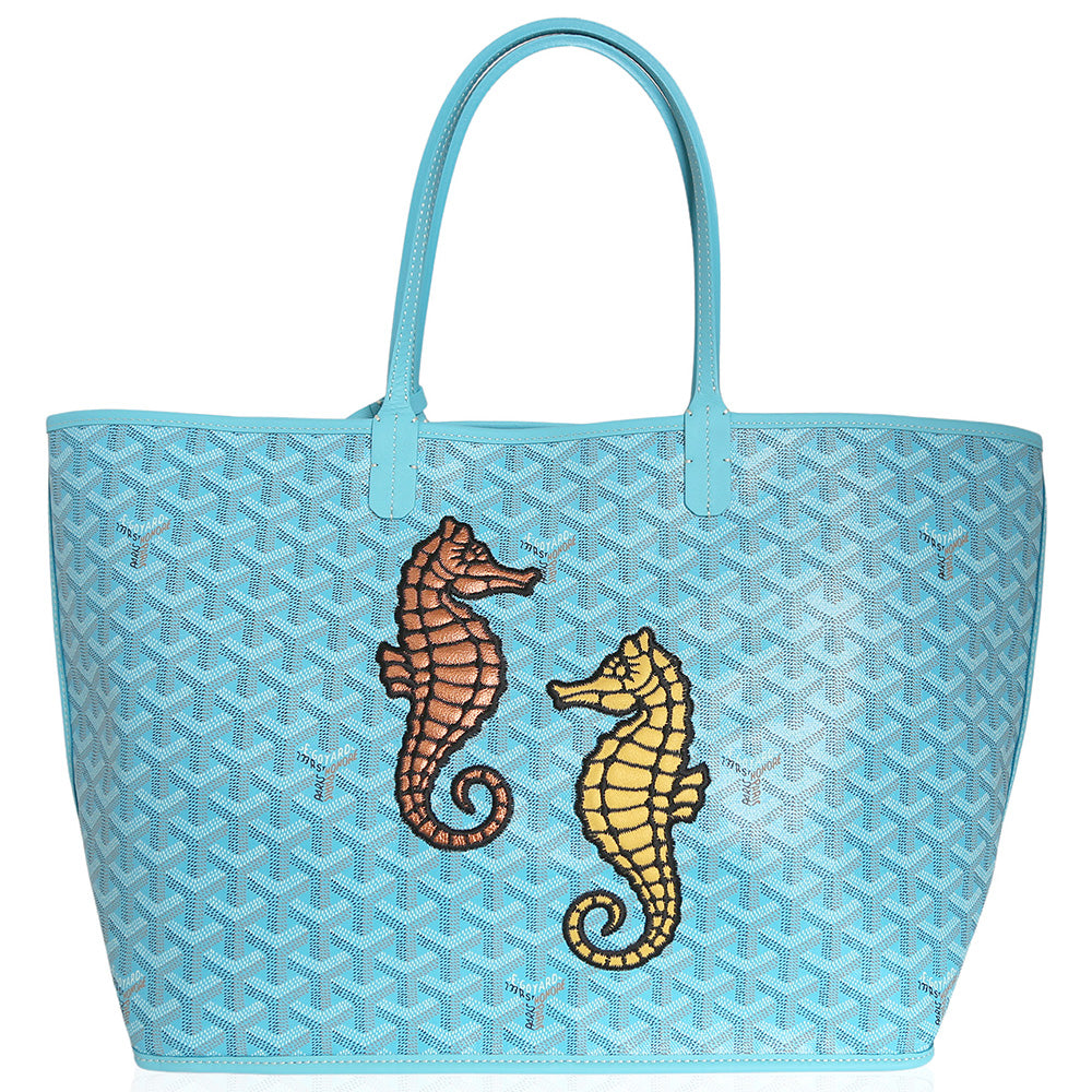 This limited-edition Goyard Anjou Seahorse Bag is Saint Louis reinterpreted. Reversible and versatile, with Goyardine canvas on one side and leather on the other. The intricate embroidery design showcases two seahorses, a symbol of everlasting love, making it a meaningful and chic accessory.