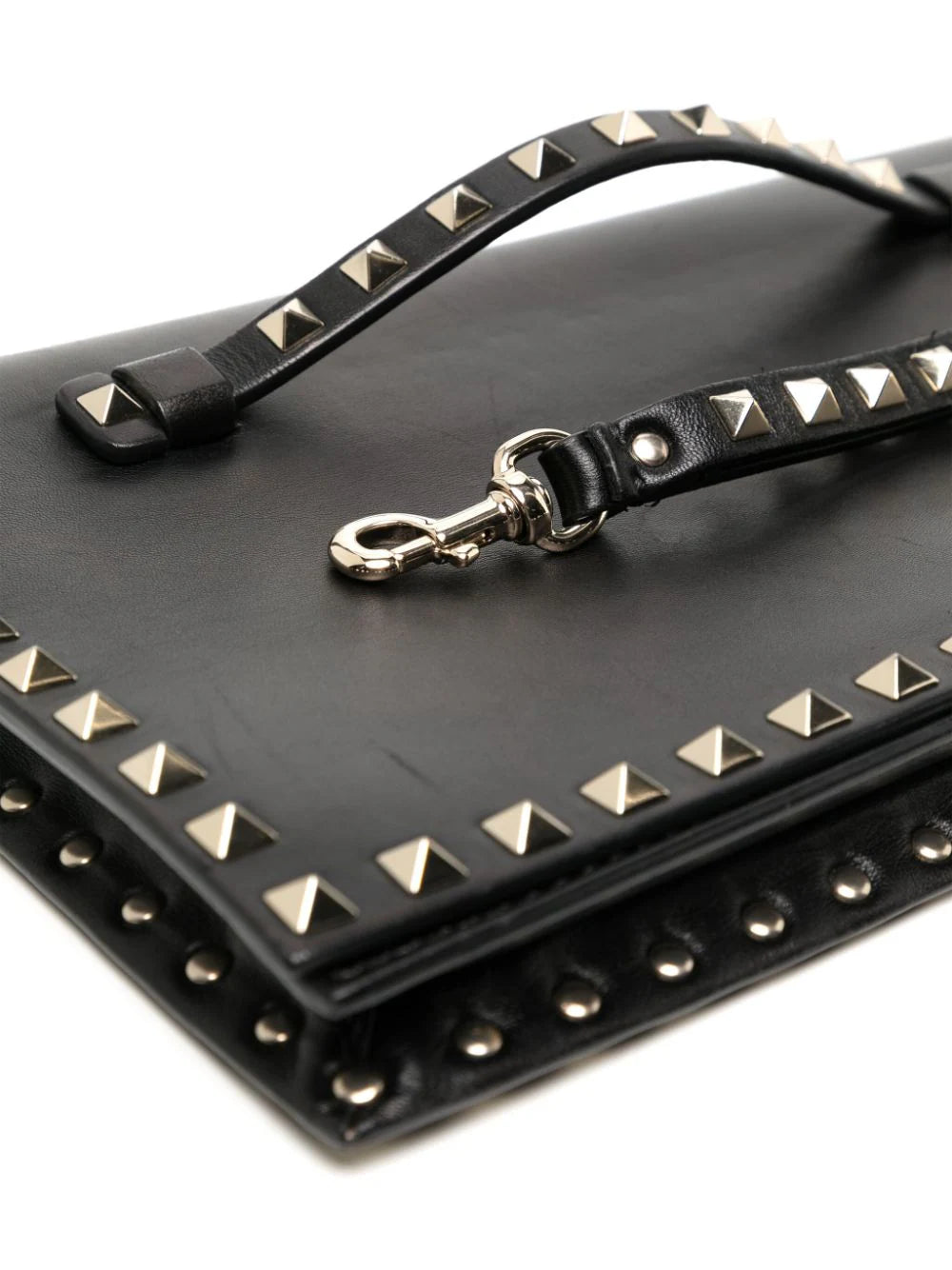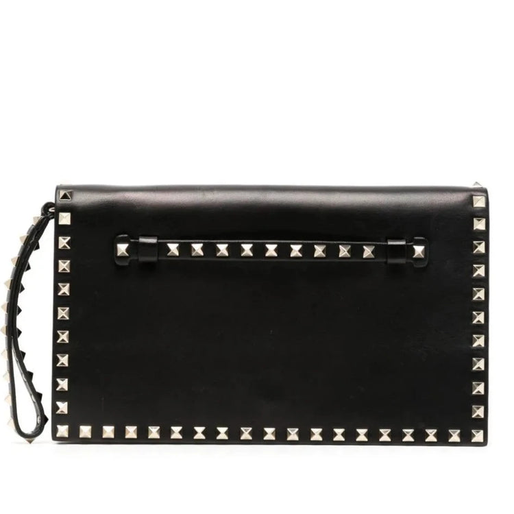 The Valentino Rockstud Leather Clutch Bag is a stunning and versatile accessory that combines edgy style with timeless elegance effortlessly. The bag features Valentino's iconic pyramid-shaped Rockstuds, meticulously applied along the edges. The bag comes with a detachable leather wrist strap, providing a convenient hands-free option and versatility.
