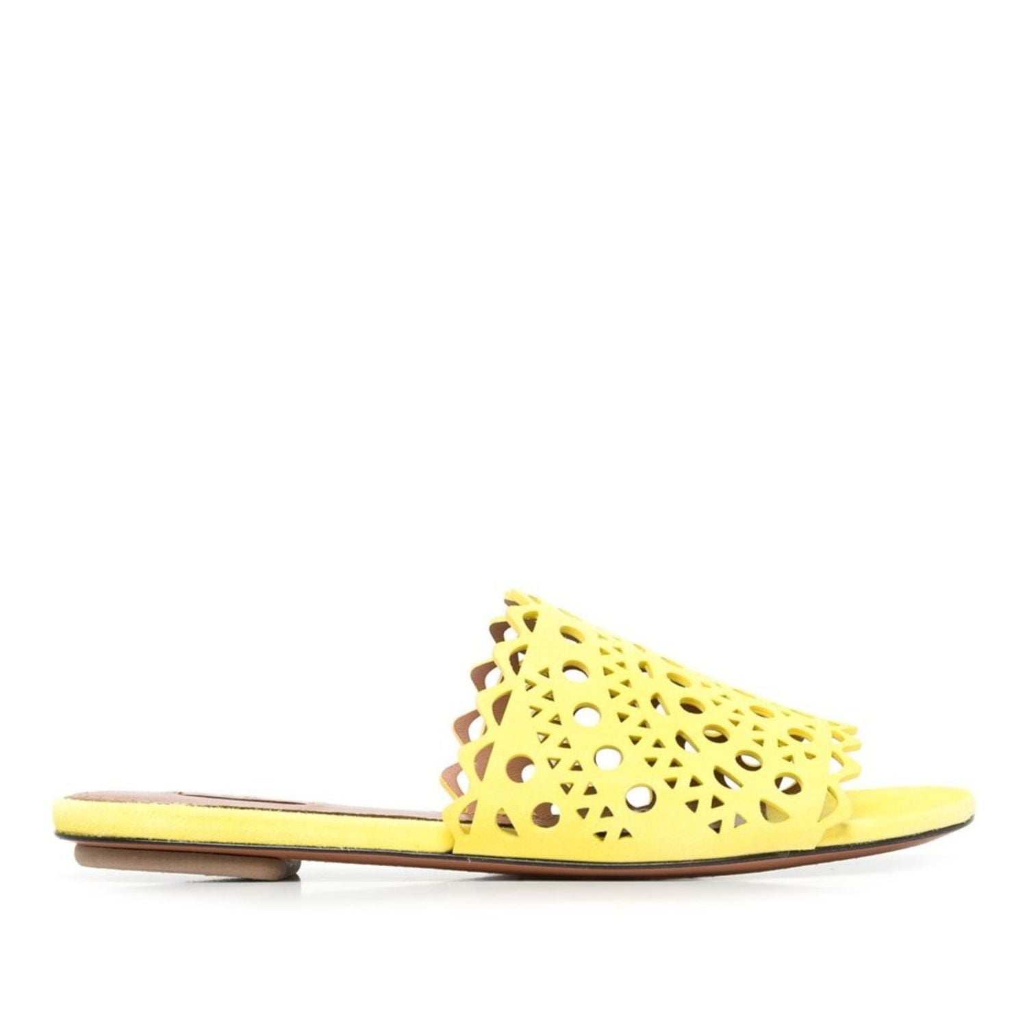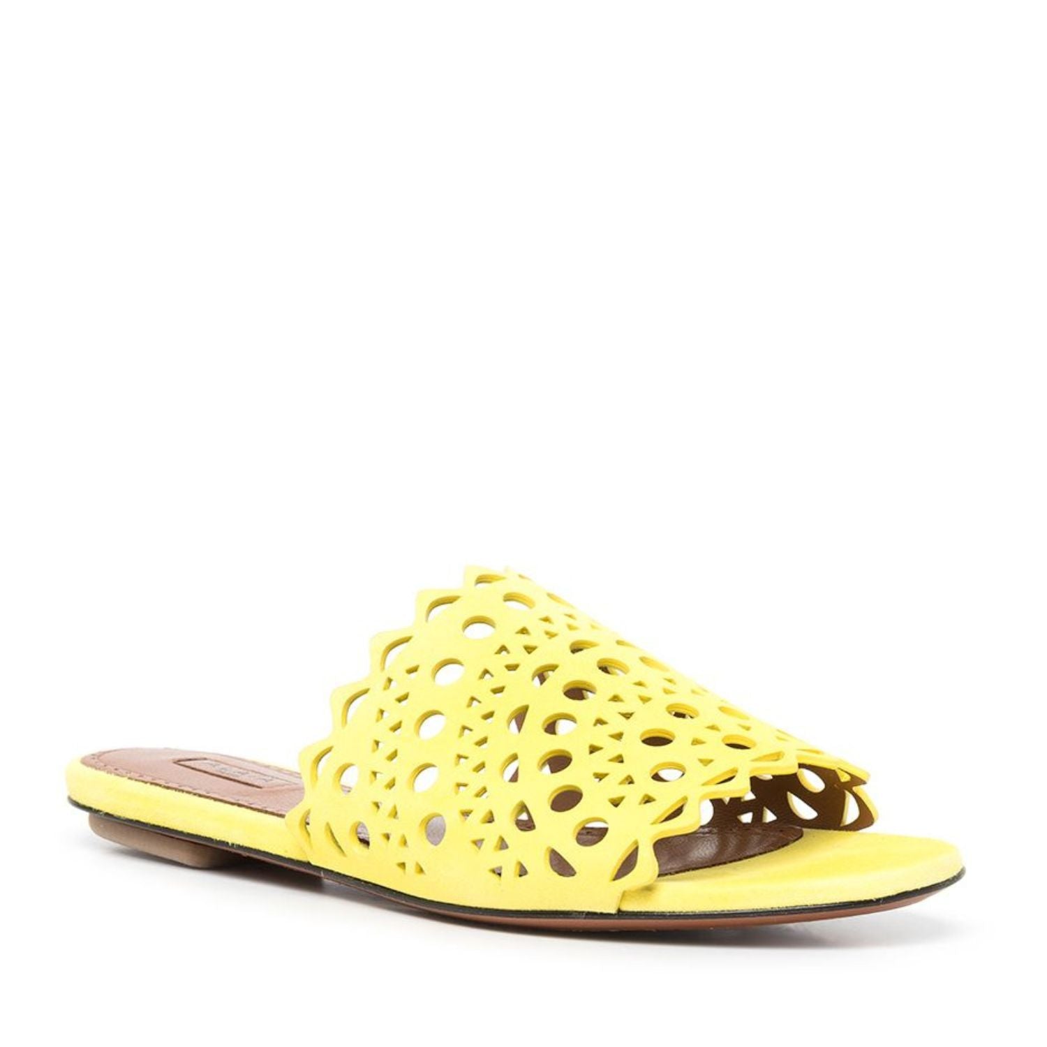 Crafted in Italy with luxurious buttery soft leather, these sandals showcase the iconic "Vienne" motifs and scalloped edges that are synonymous with Alaïa's craftsmanship. Featuring wide straps, round toes, and slender soles, these exquisite yellow sandals are a testament to the brand's meticulous attention to detail.