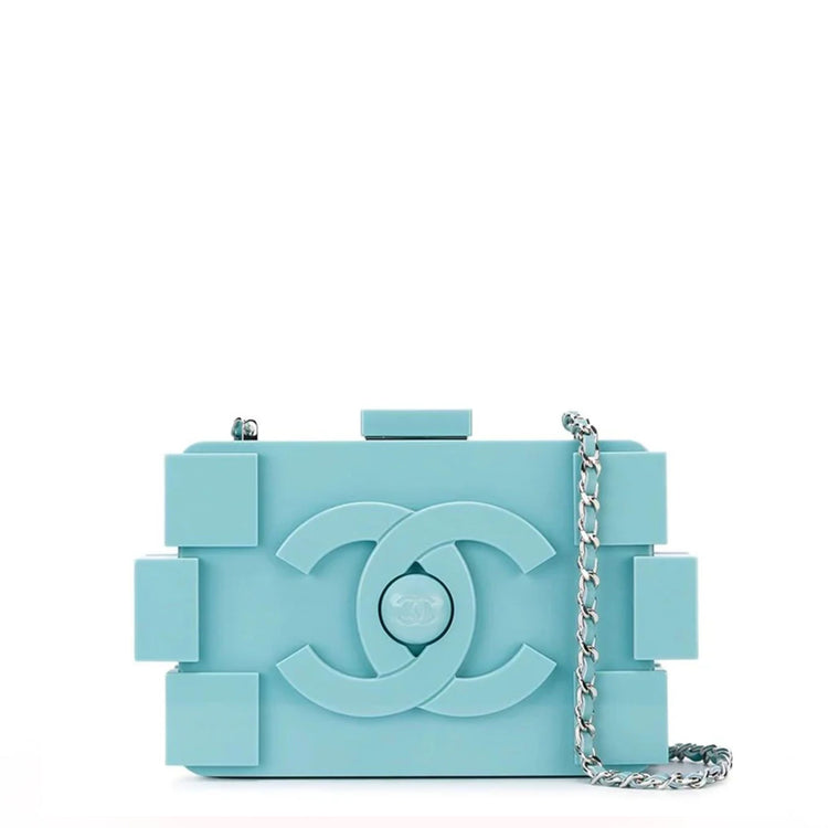 Chanel's playful lego clutch gets a fierce upgrade. This rare and collectable clutch bag is formed of baby blue plexiglass. Featuring prominent logos across both sides of its hard-case facade and its push closure on top, this piece is a must for any avid Chanel lover. The bag has an optional blue leather-laced silver-tone chain strap.