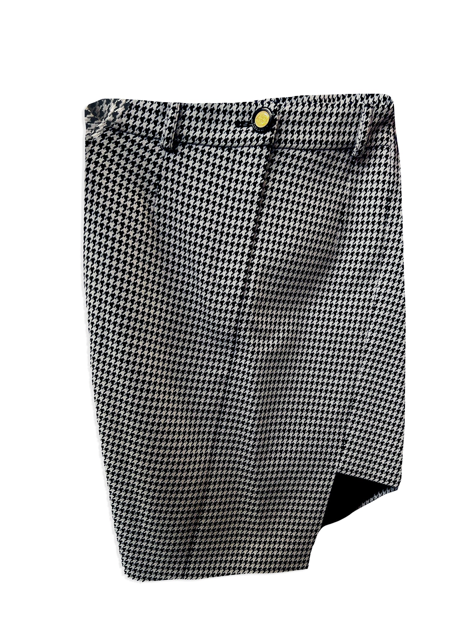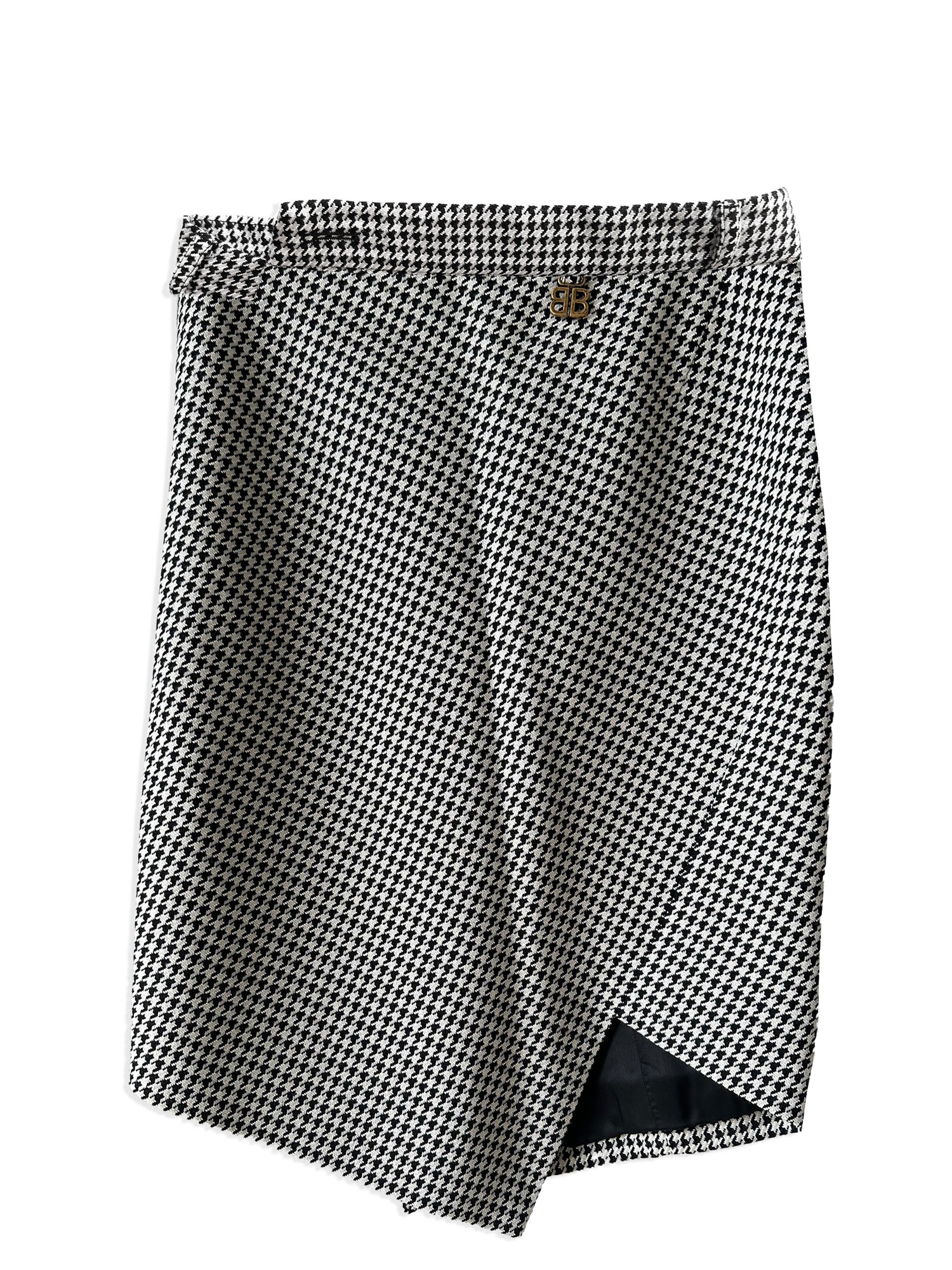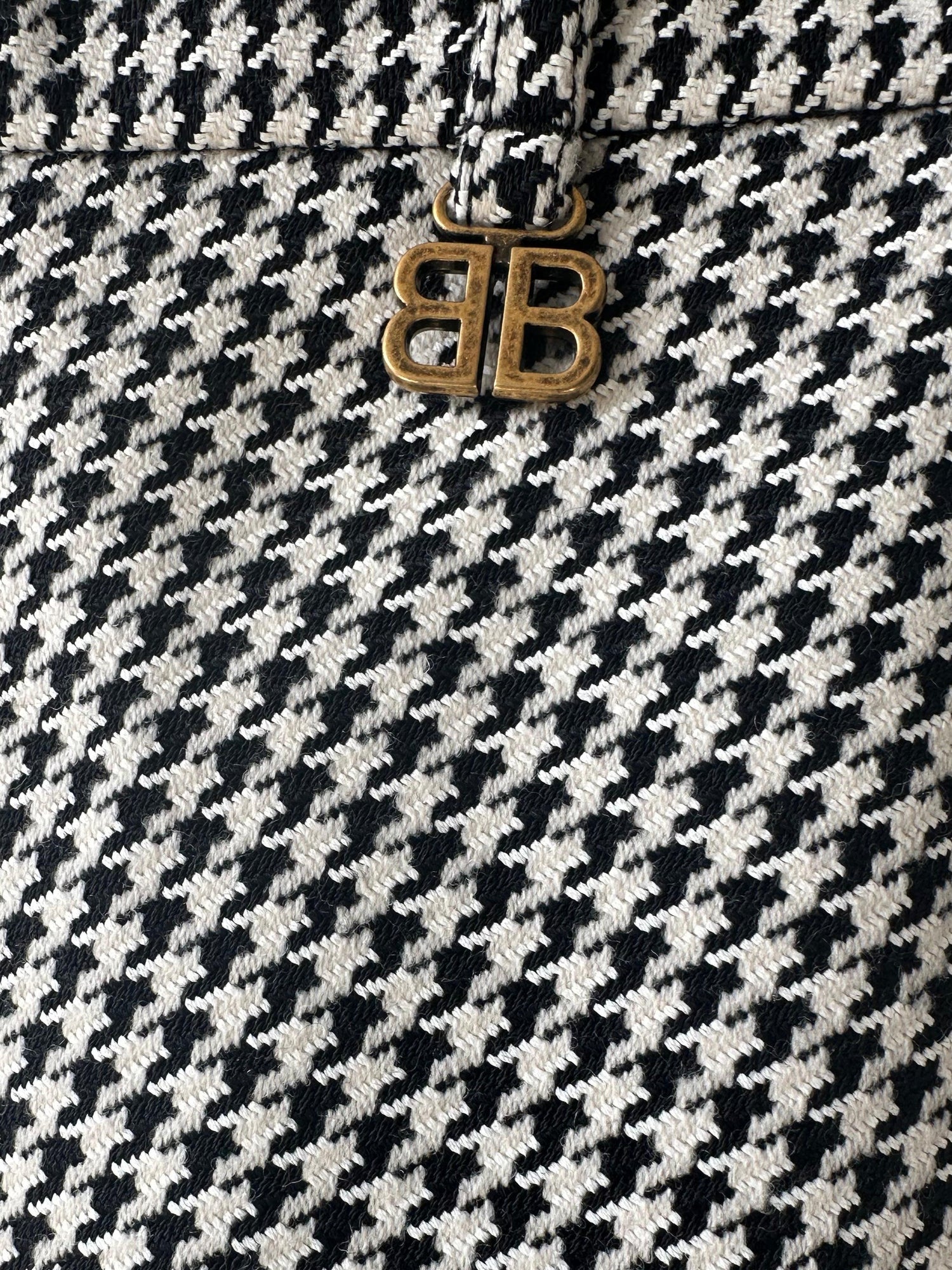 The Balenciaga Balenciaga Houndstooth skirt in black and white, features an asymmetrical cut for a unique and edgy look.