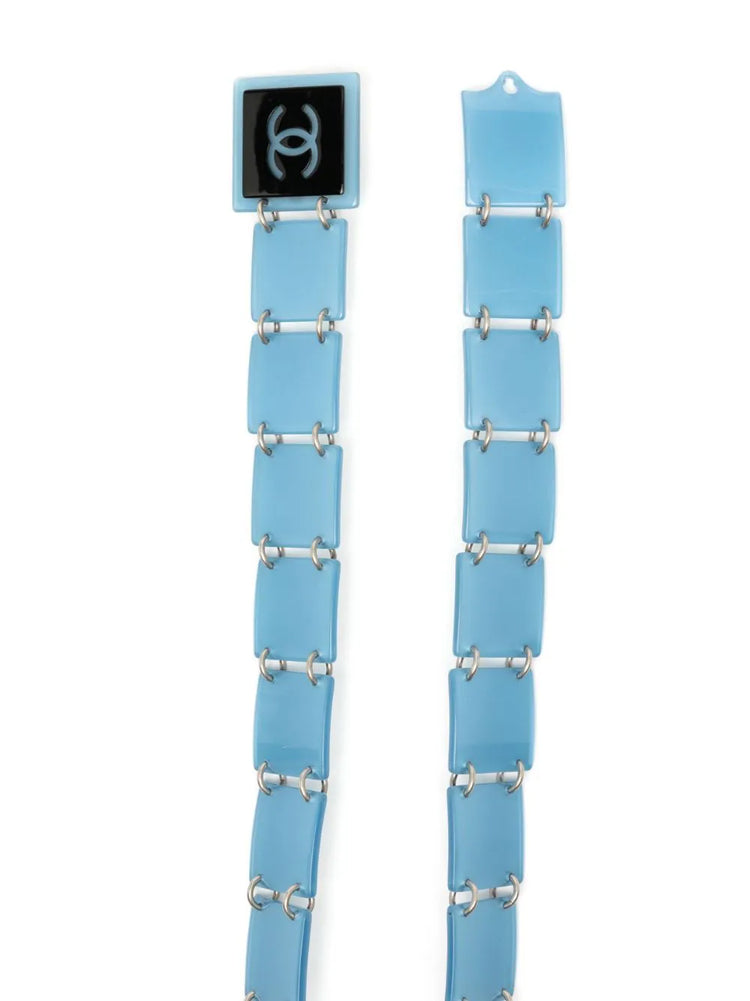 Add a touch of style to any ensemble with this vintage plexiglass Chanel belt. Showcasing articulated blue plaques linked together. The belt fastens using a hook closure. You would be forgiven for thinking this belt was actually for your jewellery box.