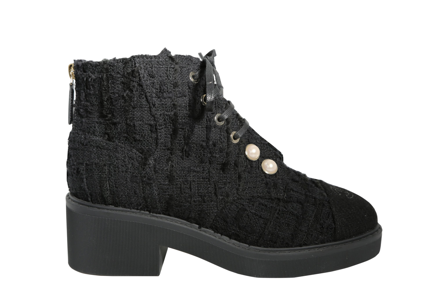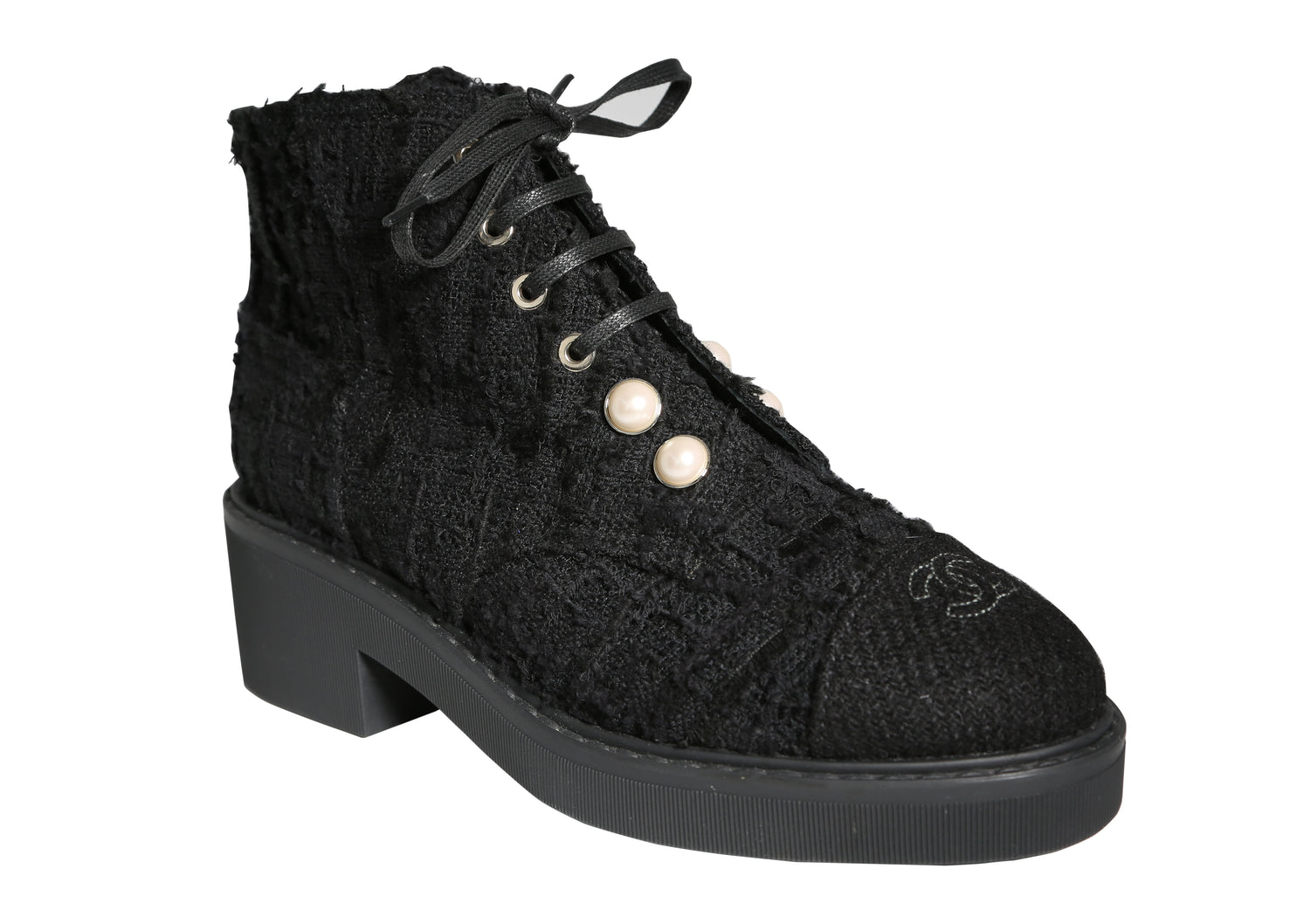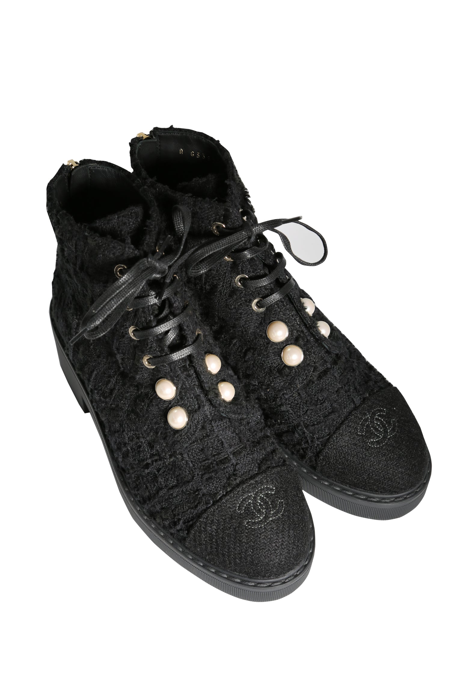 The Tweed Snow Boots by Chanel showcase an interlocking CC logo on the front and are adorned with pearls for a luxurious touch.